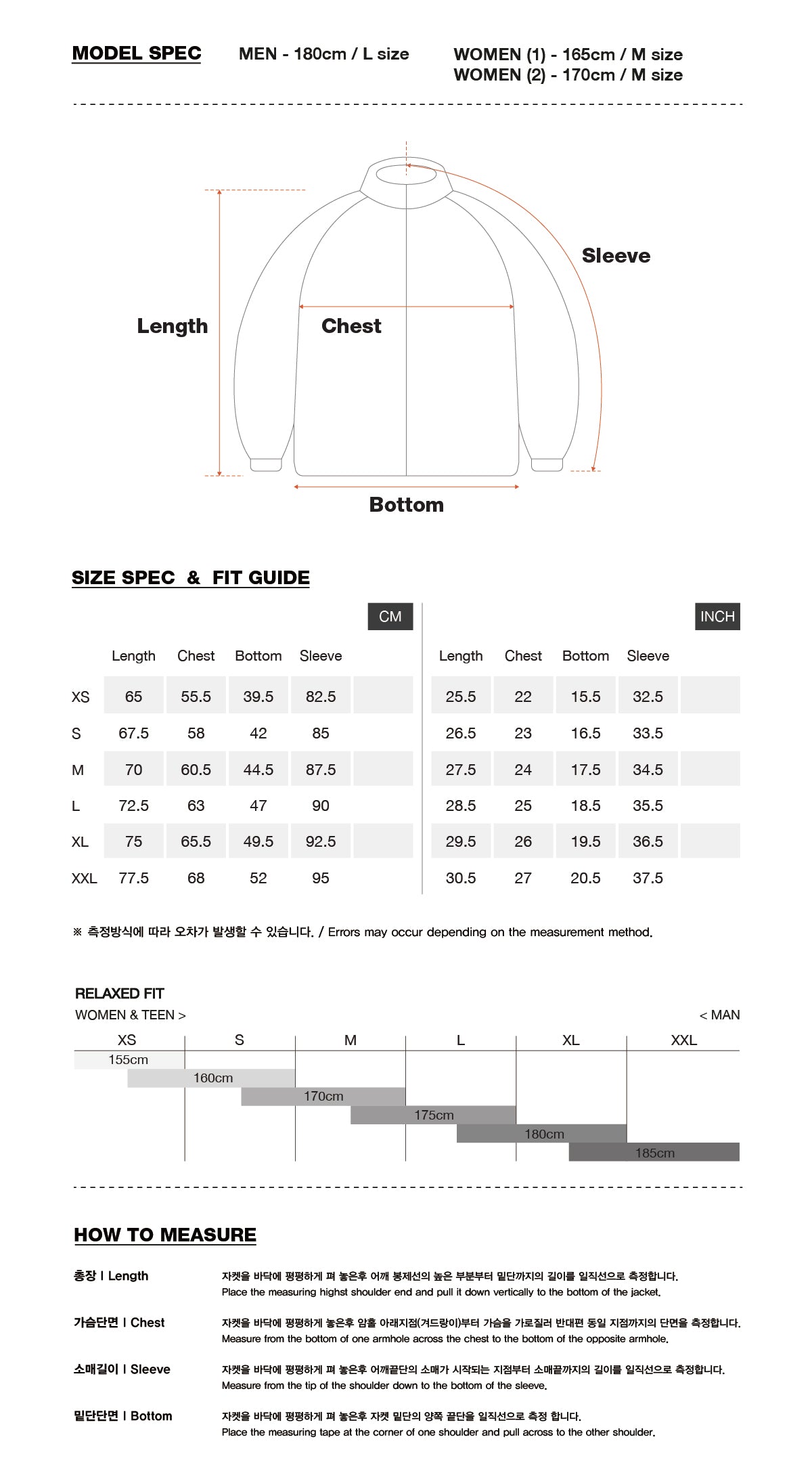 * Model spec : MEN - 180cm, L size / WOMEN(1) - 165cm, M size / WOMEN(2) - 170cm, M size