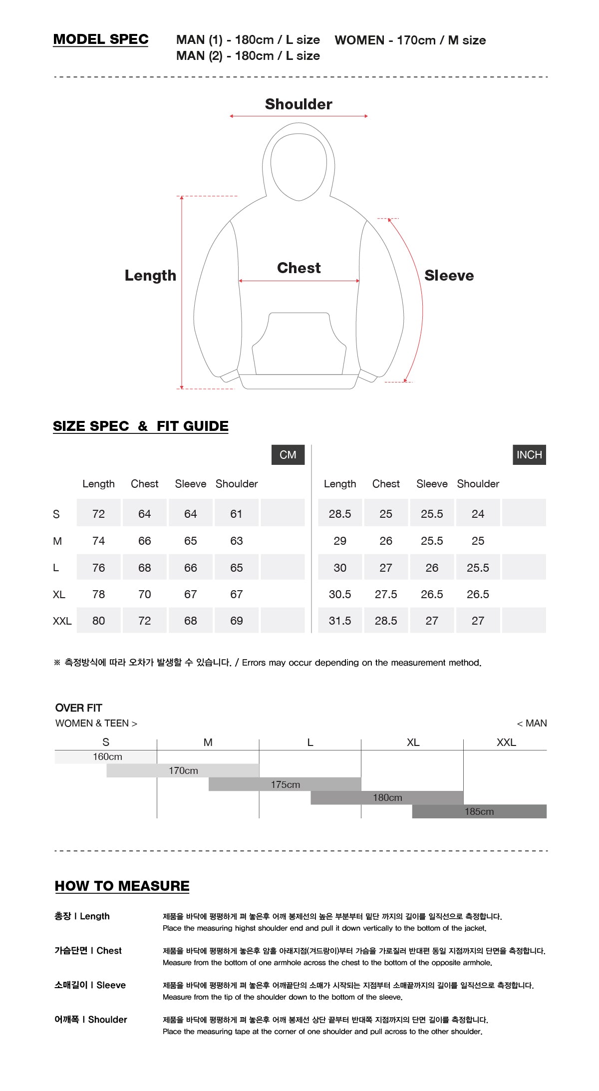 * Model spec : MEN(1) - 180cm, L size / MEN(2) - 180cm, L size / WOMEN - 170cm, M size