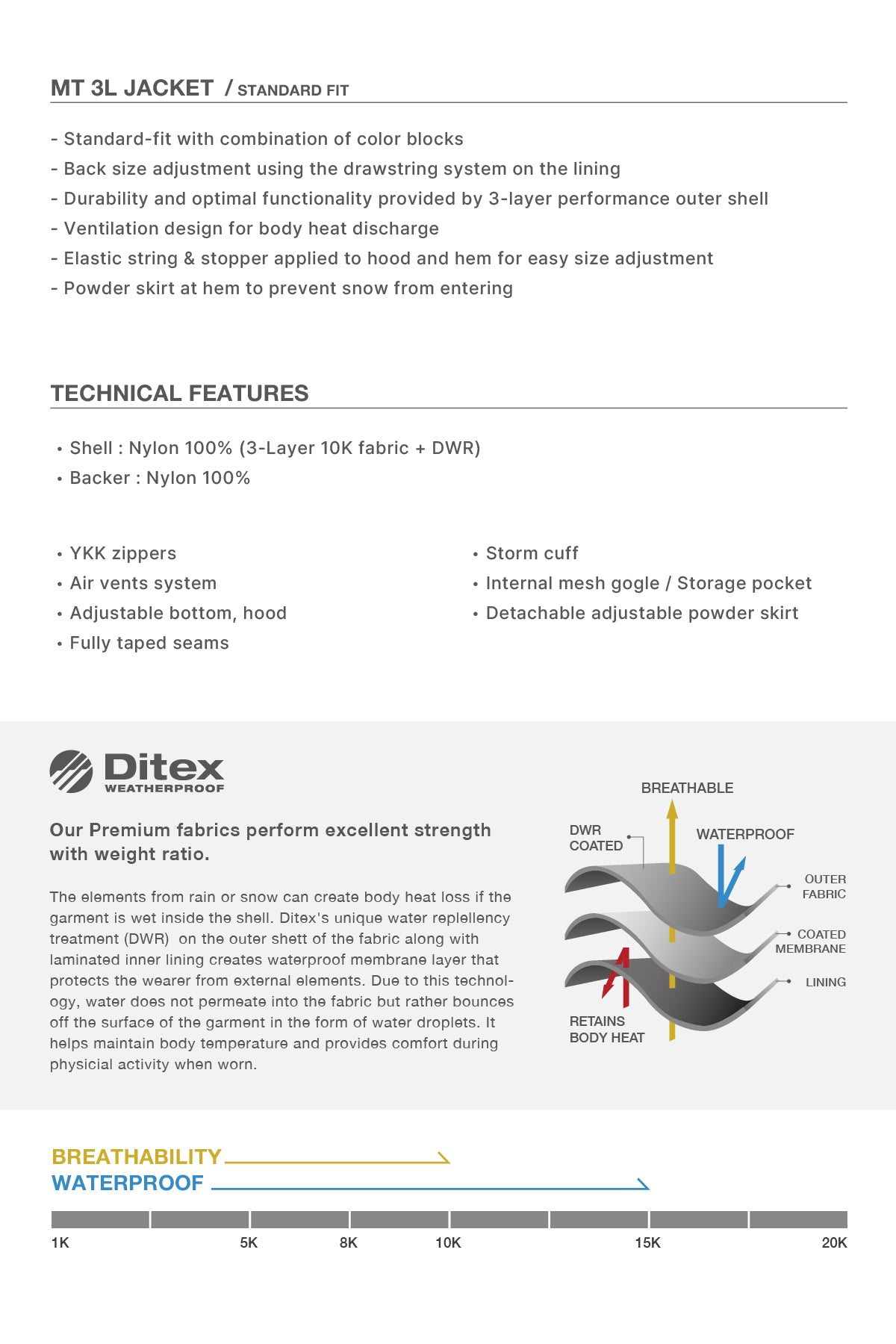 - Waterproof : 15K / Breathability : 10K