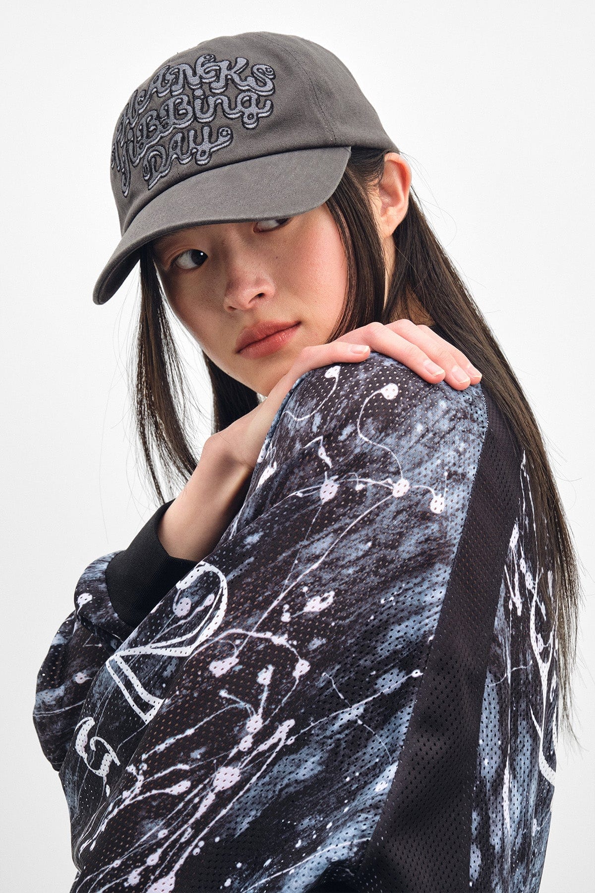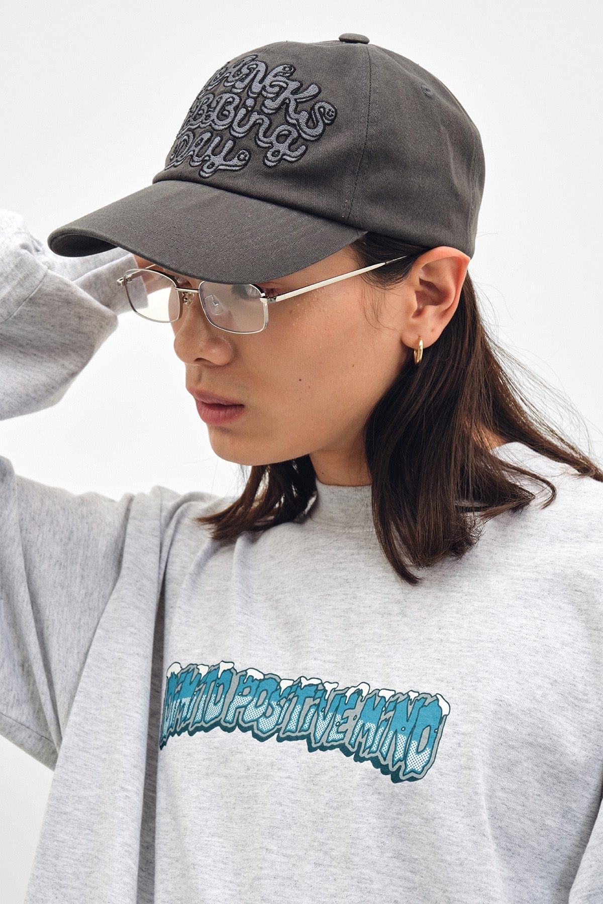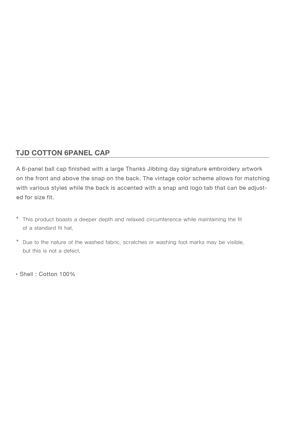 A 6-panel ball cap finished with a large Thanks Jibbing day signature embroidery artwork on the front and above the snap on the back. The vintage color scheme allows for matching with various styles while the back is accented with a snap and logo tab that can be adjusted for size fit.