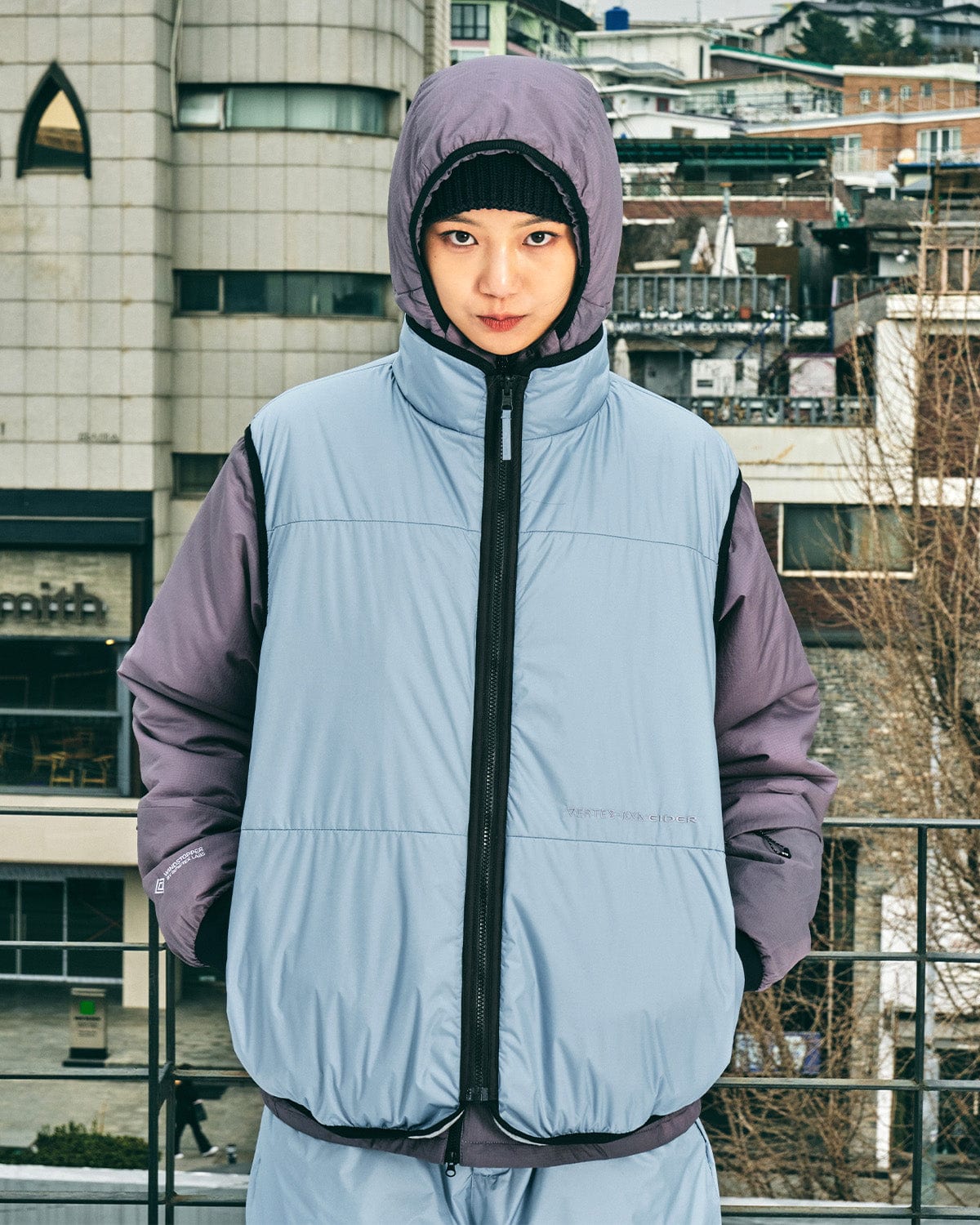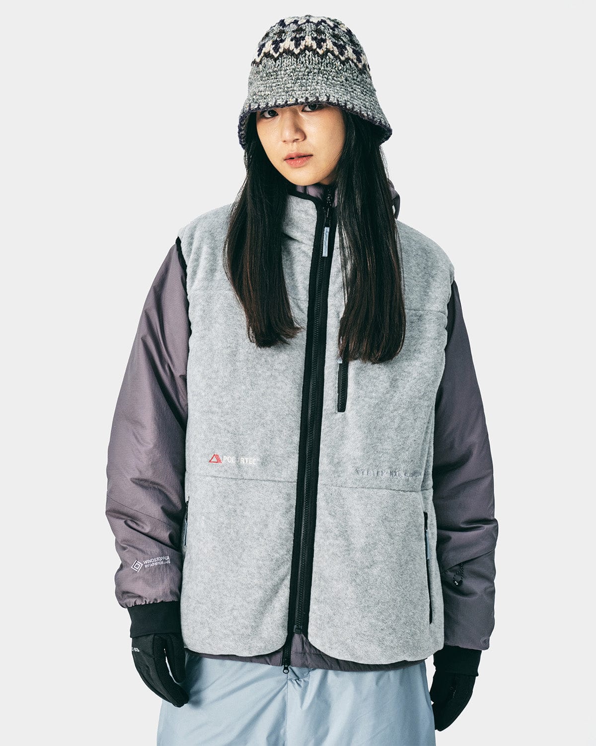 It is a reversible vest designed withDITEX fabric providing excellent water-repellentperformance and Polartec Micro Fleece fabric onthe other side to provide a different moodswhen worn in reverse.