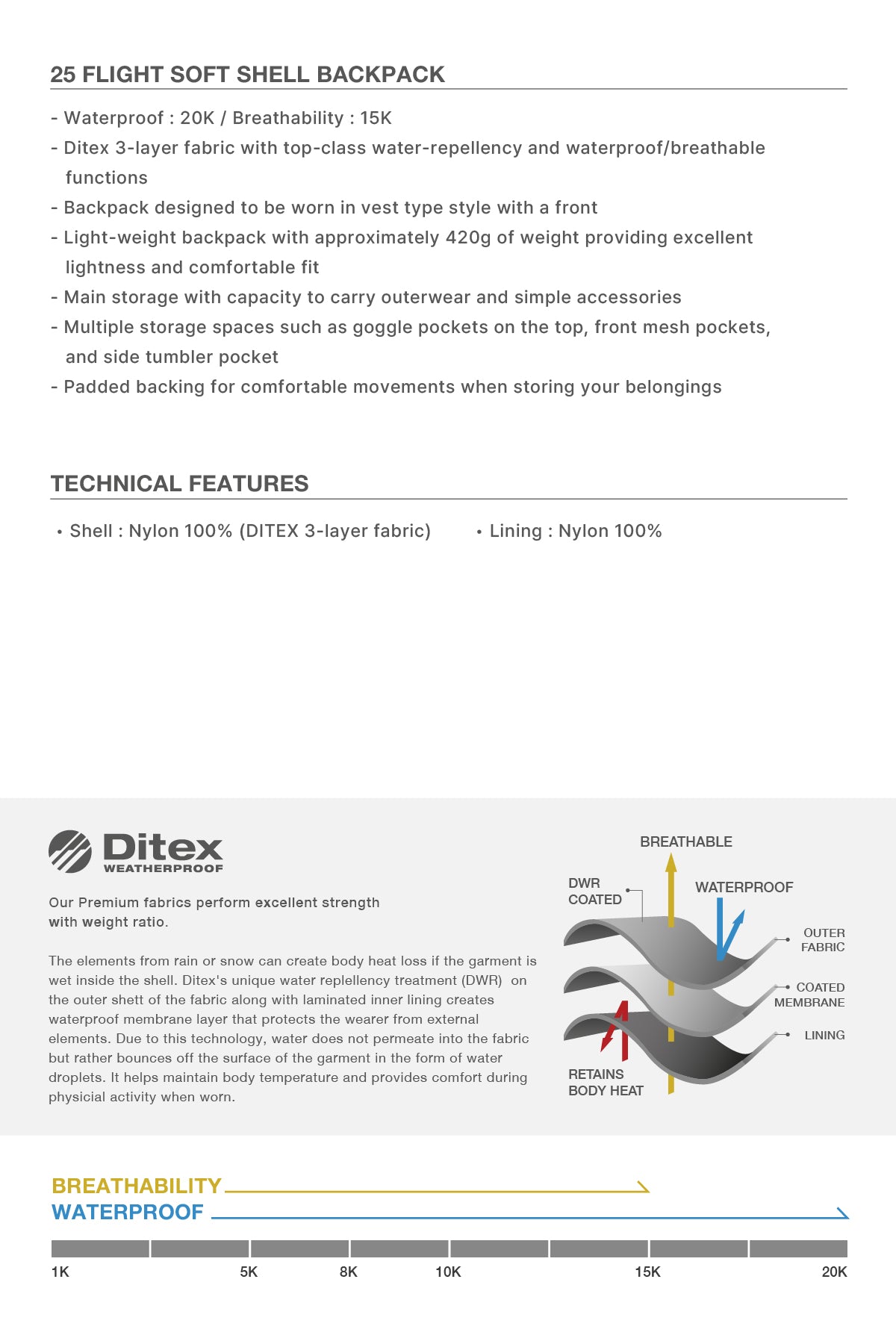 - Waterproof : 20K / Breathability : 15K