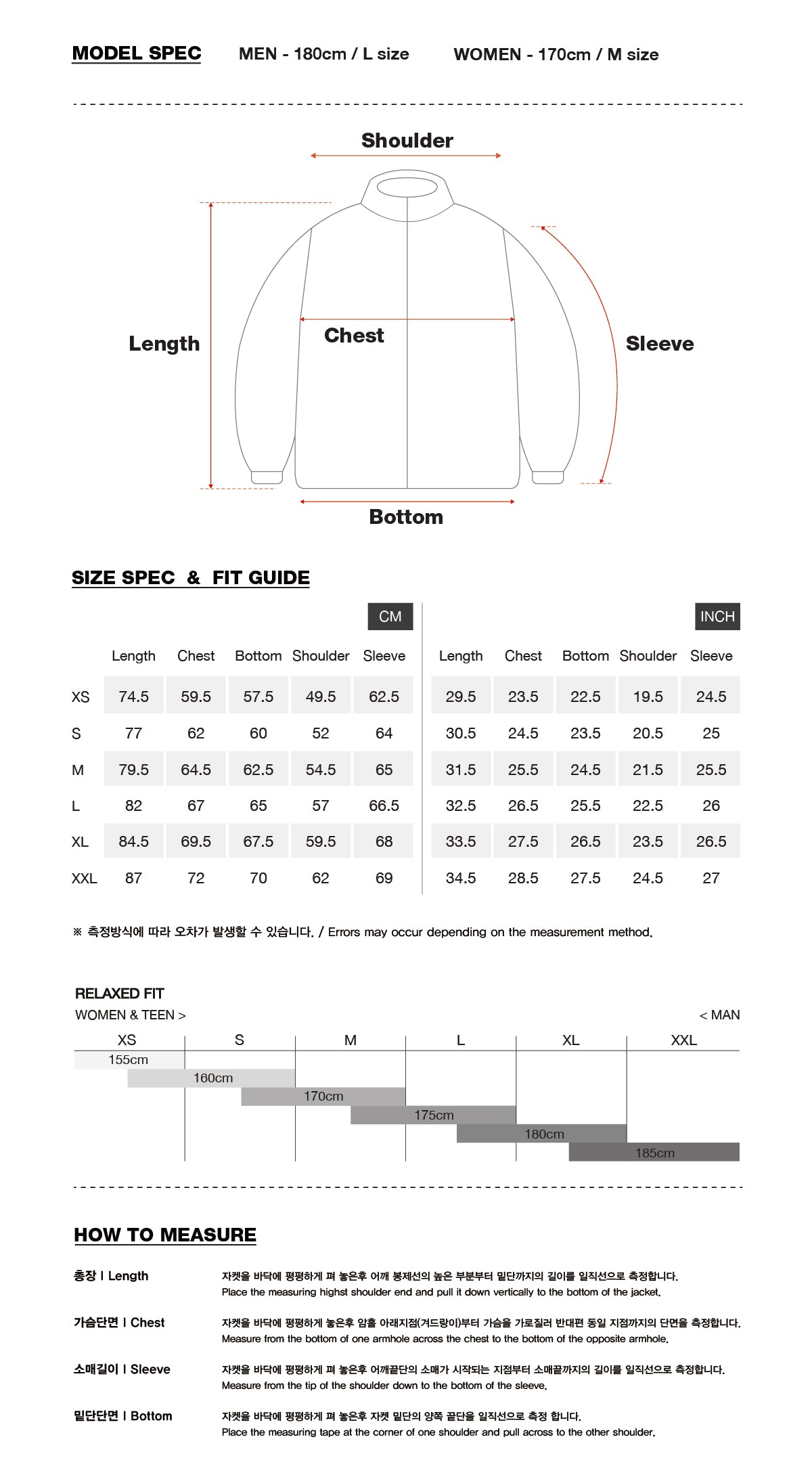 * Model spec : MEN - 180cm, L size / WOMEN - 170cm, M size
