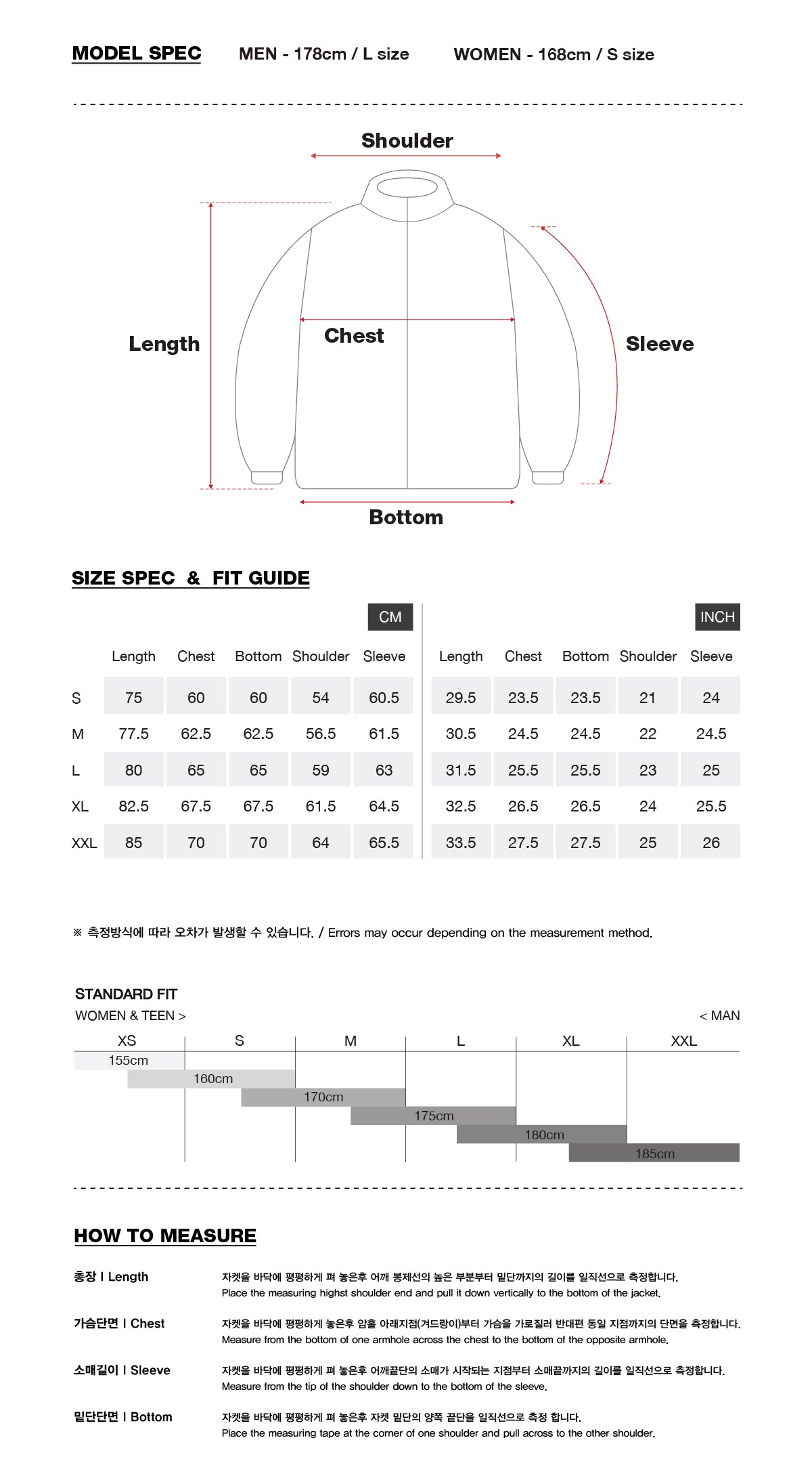 * Model spec : MEN - 178cm, L size / WOMEN - 168cm, S size