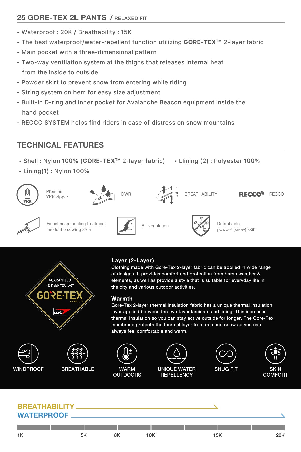 - The best waterproof/water-repellent function utilizing GORE-TEX™ 2-layer fabric