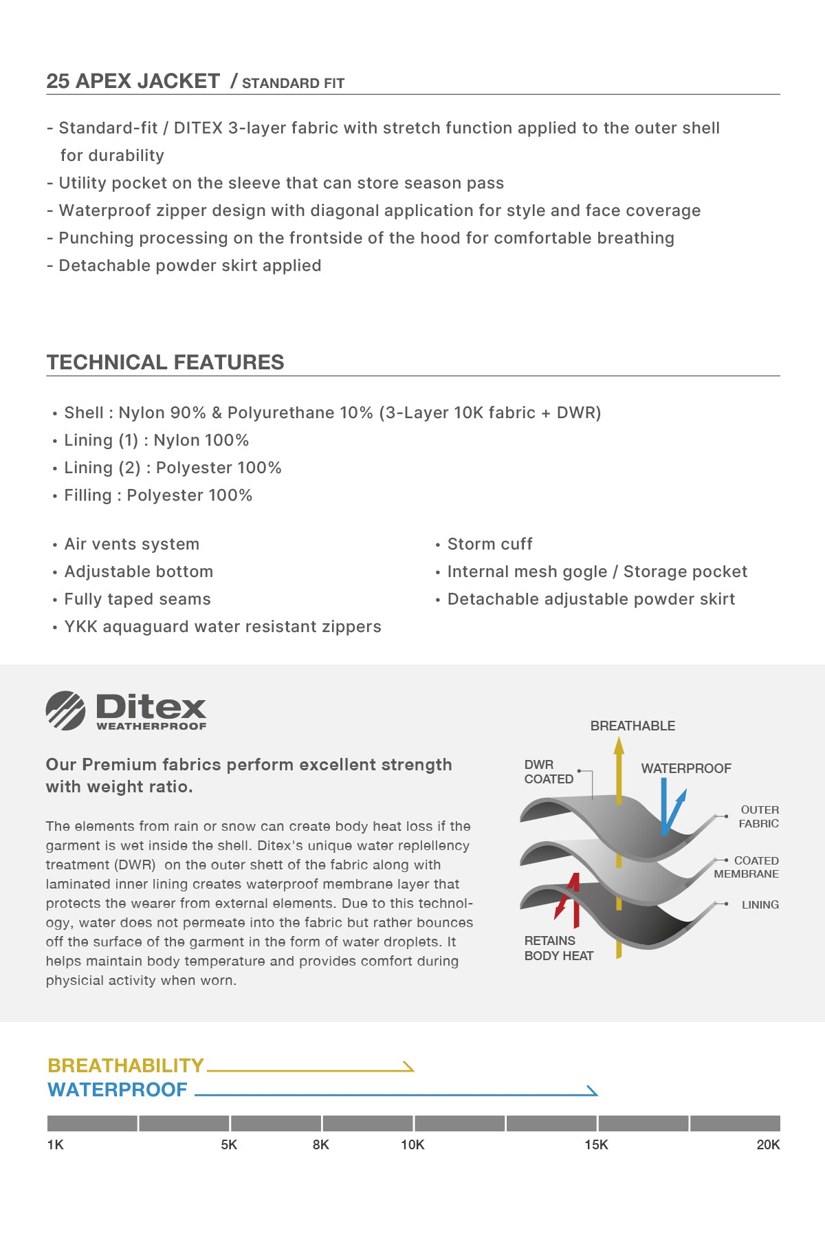 - Waterproof : 15K / Breathability : 10K