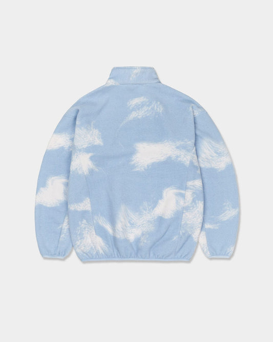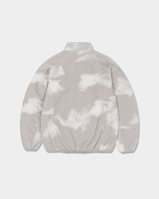This is a fleece half-zip shirt made of fleece material with a soft and cozy feel to the touch. Even in winter, you can maintain warm body temperature even if you wear it with a lightweight outerwear together without any discomfort due to its light fit. The design features a tie-dye-style pattern print and a relaxed fit along with a front zip pocket for comfortable wear during various activities or lifestyle.
