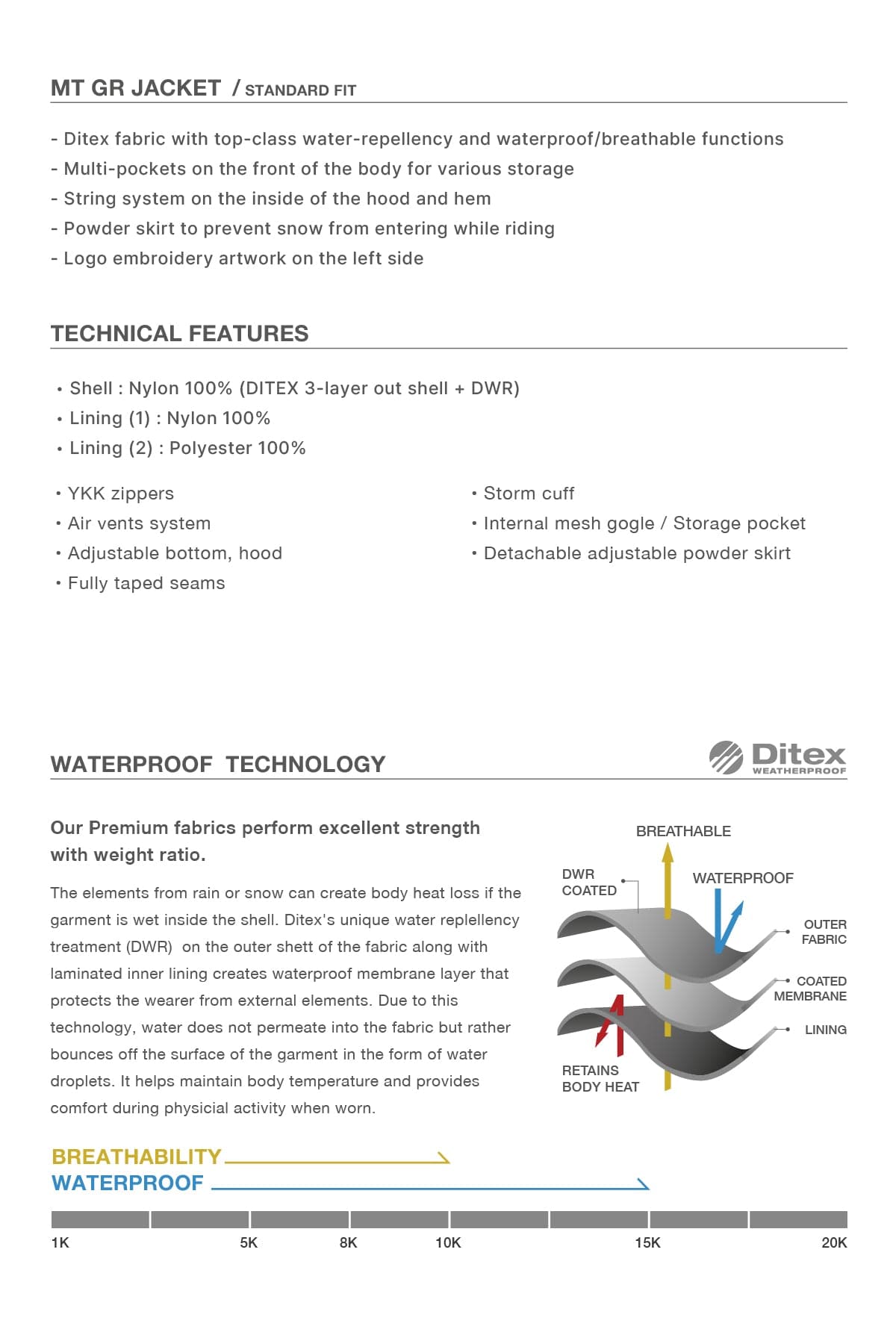 - Ditex fabric with top-class water-repellency and waterproof/breathable functions