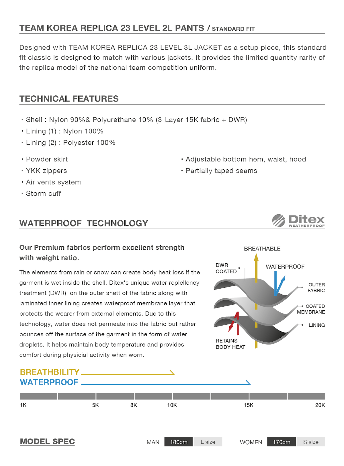 This pants was designed as a set-up piecethat is a perfect match with the TEAM KOREA REPLICA23 LEVEL 3L JACKET. The classic design of the standard fitis designed to match a variety of jackets.These are replica pants that combine the functional excellence that snowboarding pants should have and therarity of the official competition uniform of theKorean freestyle national snowboarding team.