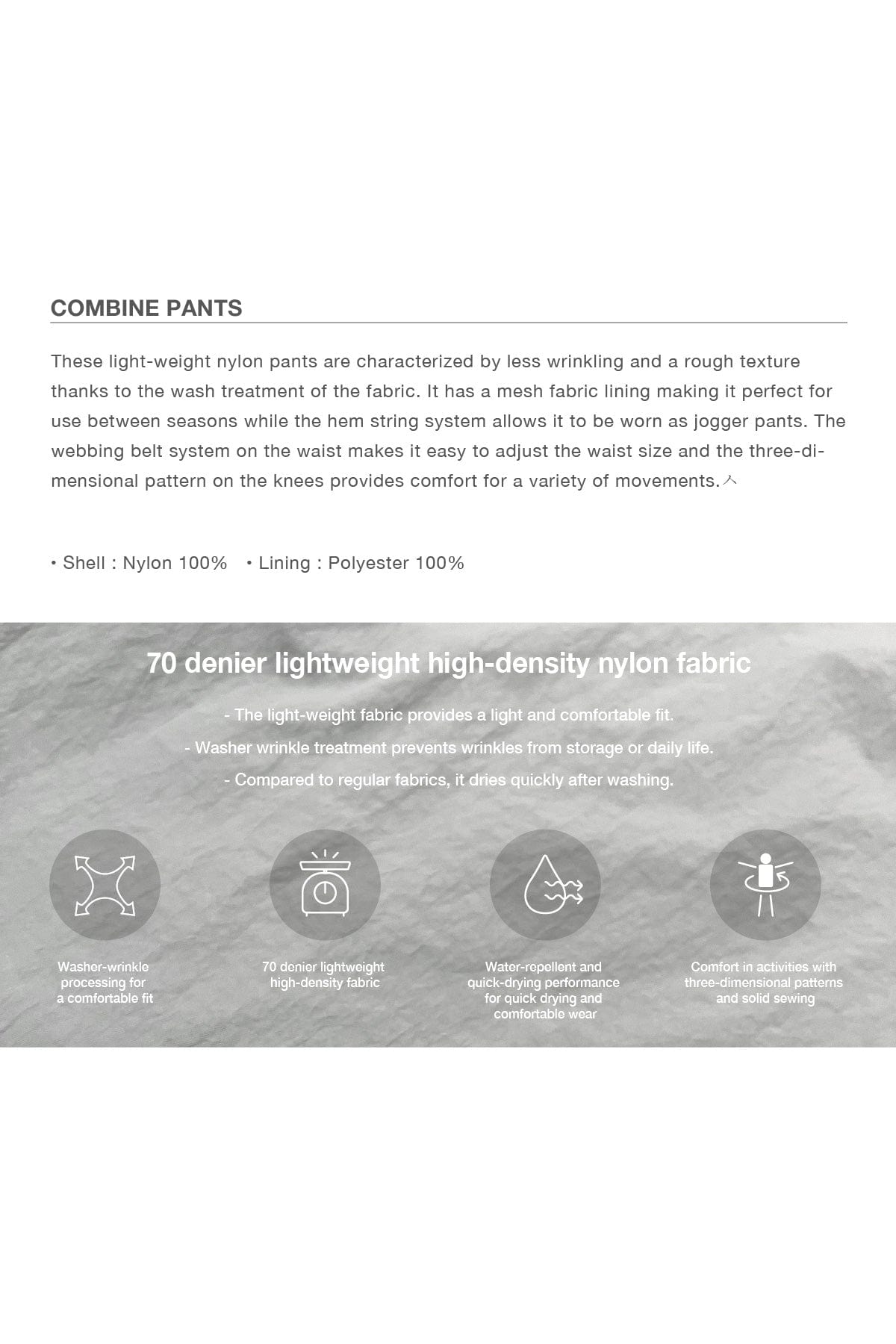 It is made of ultra-lightweight nylon material that features a rough texture and less wrinkles due to the pre-wash treatment to the fabric. It has an inner lining for added benefit as item to use in between seasons. It can also be worn as jogger pants with the hem string adjustment system. The buckle belt makes it easy to adjust the waist for comfort and the three-dimensional pattern on the knee provides comfortable movement for various daily activities.
