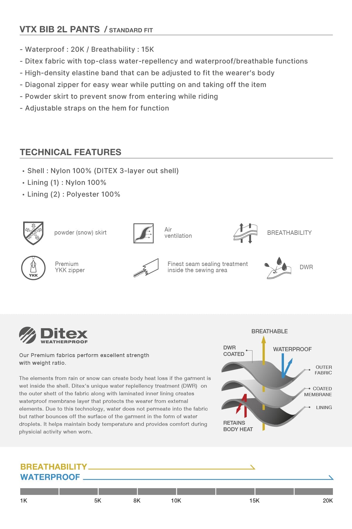 - Waterproof : 20K / Breathability : 15K