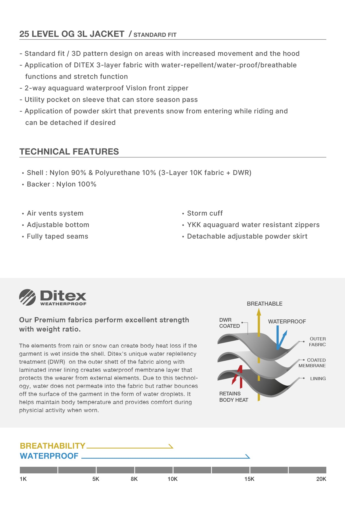 - Waterproof : 15K / Breathability : 10K