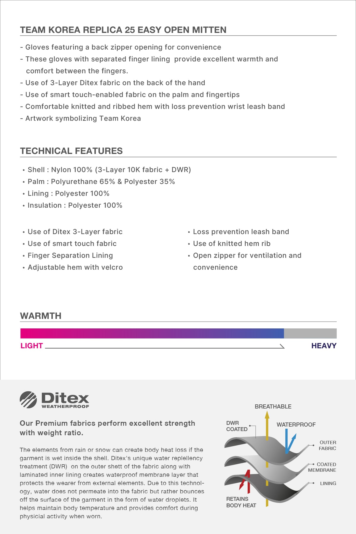 - Use of 3-Layer Ditex fabric on the back of the hand