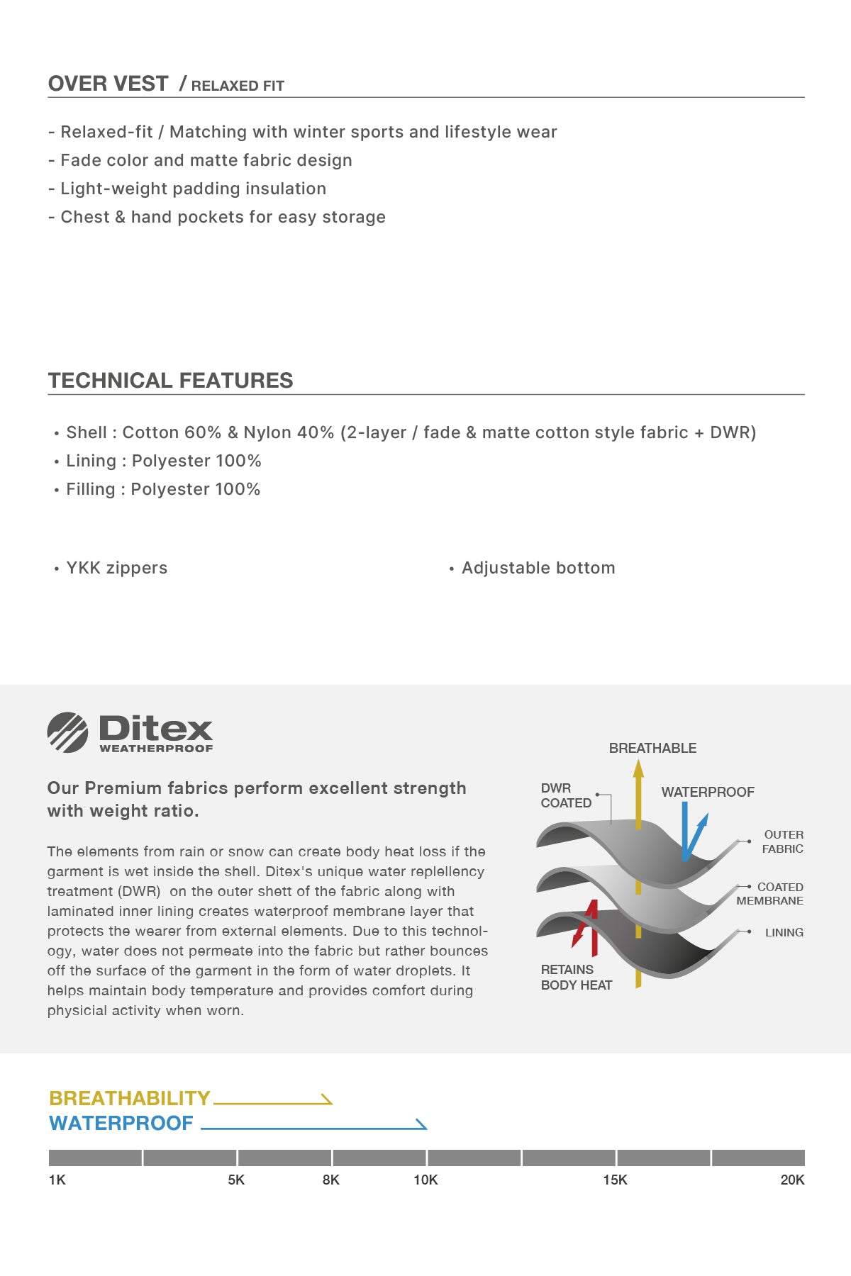 - Waterproof : 10K / Breathability : 8K