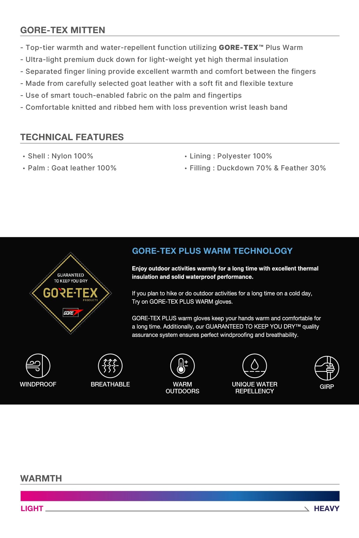 - Top-tier warmth and water-repellent function utilizing GORE-TEX™ Plus Warm