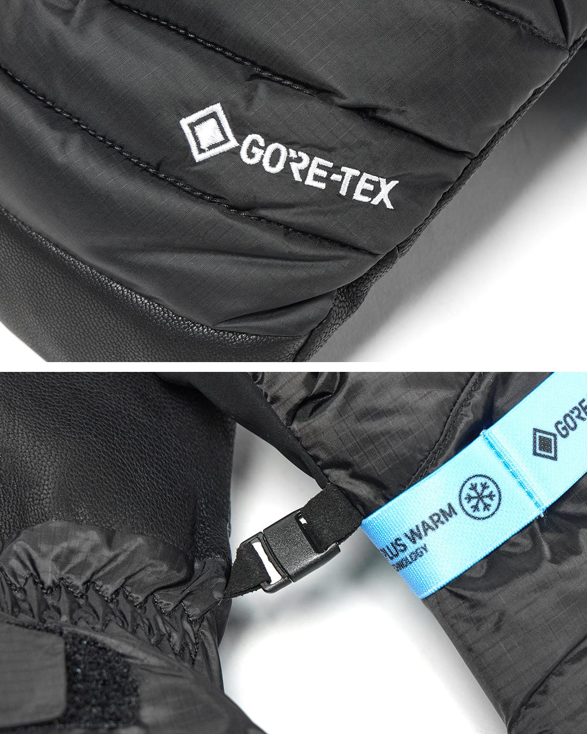 In addition to the warmth, waterproof protection, and excellent moisture permeability of Gore-Tex Plus Warm insert together with the use of premium duck down and primaloftFilling keeps the wearer's hands dry and warm even in the most extreme environments. The natural goat leather finished on the entire palm and thumb area adds a soft yet stable grip and the inside of the mitten is separated for each finger, so you can maintain a cozy comfortable fit for a long wear duration. Smartphone screen touch functions are built into the thumb fingers allowing you to perform simple actions such as answering a call without taking off your gloves. In addition, a highly elastic leash cord is installed on the wrist, fundamentally preventing the risk of loss in situations where the mitten must be taken off during activities.