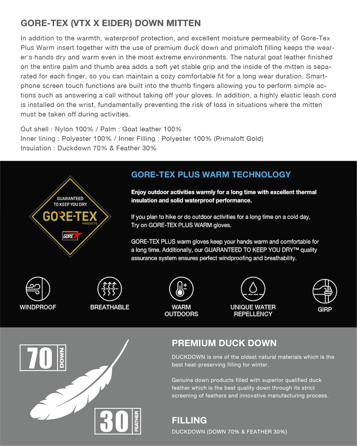 In addition to the warmth, waterproof protection, and excellent moisture permeability of Gore-Tex Plus Warm insert together with the use of premium duck down and primaloftFilling keeps the wearer's hands dry and warm even in the most extreme environments. The natural goat leather finished on the entire palm and thumb area adds a soft yet stable grip and the inside of the mitten is separated for each finger, so you can maintain a cozy comfortable fit for a long wear duration. Smartphone screen touch functions are built into the thumb fingers allowing you to perform simple actions such as answering a call without taking off your gloves. In addition, a highly elastic leash cord is installed on the wrist, fundamentally preventing the risk of loss in situations where the mitten must be taken off during activities.