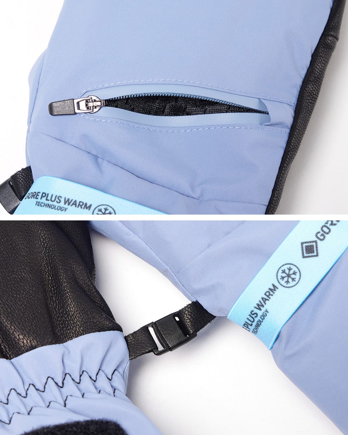 In addition to the warmth, waterproof protection, and excellent moisture permeability of Gore-Tex Plus Warm insert together with the use of premium duck downFilling keeps the wearer's hands dry and warm even in the most extreme environments. The natural goat leather finished on the entire palm and thumb area adds a soft yet stable grip and the waterproof utility pocket on the back of the hand can store season passes or credit cards to provide added convenience to the functional performance of the product. Smartphone screen touch functions are built into the thumb fingers allowing you to perform simple actions such as answering a call without taking off your gloves. In addition, a highly elastic leash cord is installed on the wrist, fundamentally preventing the risk of loss in situations where the mitten must be taken off during activities.