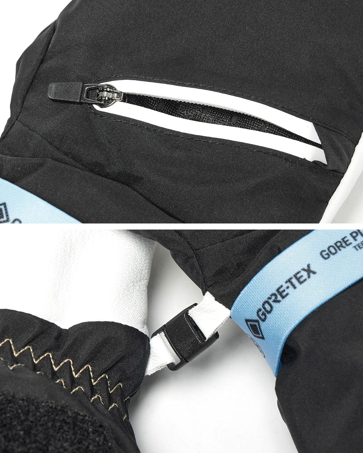 In addition to the warmth, waterproof protection, and excellent moisture permeability of Gore-Tex Plus Warm insert together with the use of premium duck downFilling keeps the wearer's hands dry and warm even in the most extreme environments. The natural goat leather finished on the entire palm and thumb area adds a soft yet stable grip and the waterproof utility pocket on the back of the hand can store season passes or credit cards to provide added convenience to the functional performance of the product. Smartphone screen touch functions are built into the thumb fingers allowing you to perform simple actions such as answering a call without taking off your gloves. In addition, a highly elastic leash cord is installed on the wrist, fundamentally preventing the risk of loss in situations where the mitten must be taken off during activities.