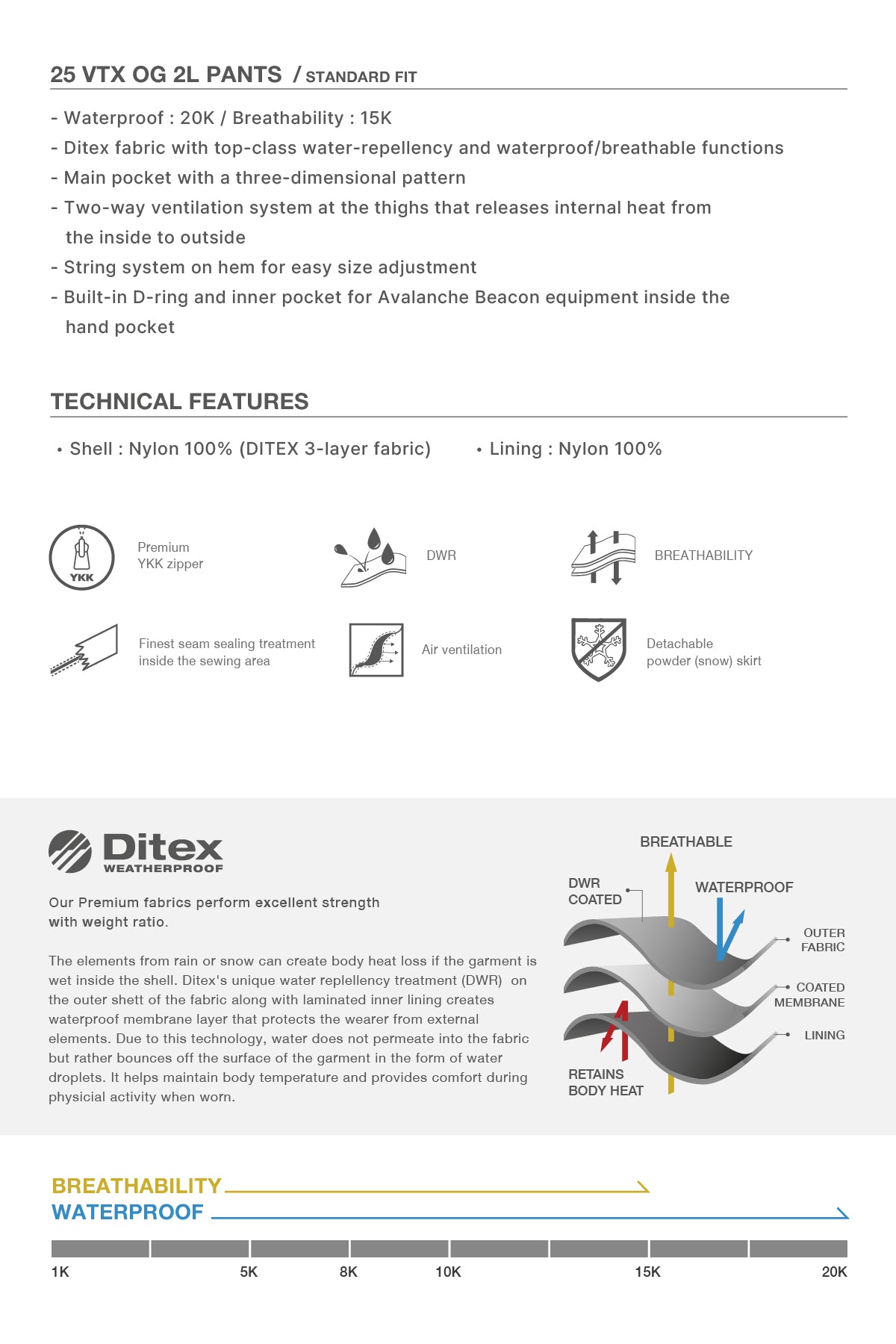 - Ditex fabric with top-class water-repellency and waterproof/breathable functions