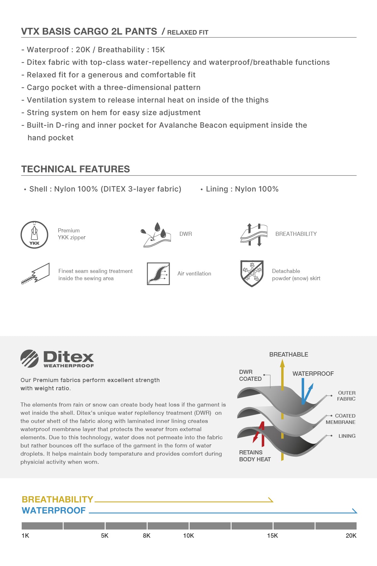 - Waterproof : 20K / Breathability : 15k
