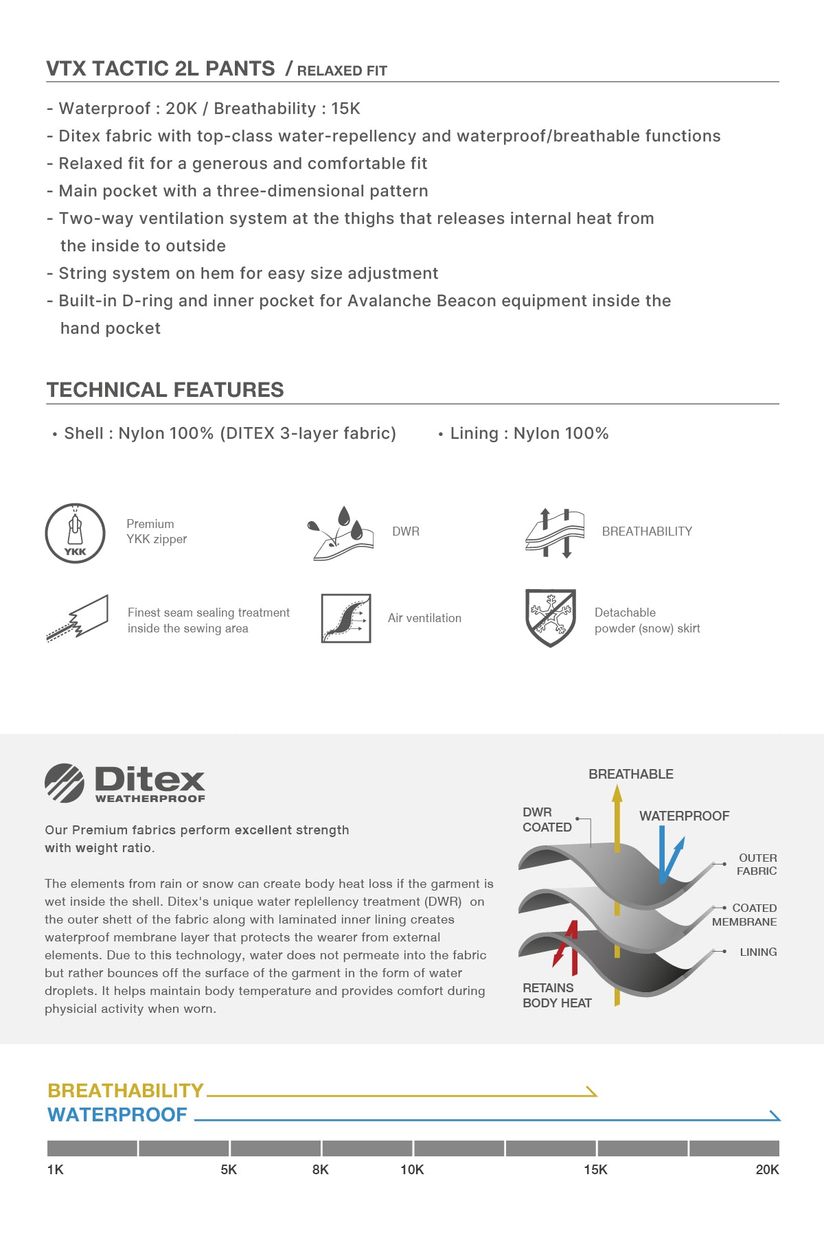 - Ditex fabric with top-class water-repellency and waterproof/breathable functions