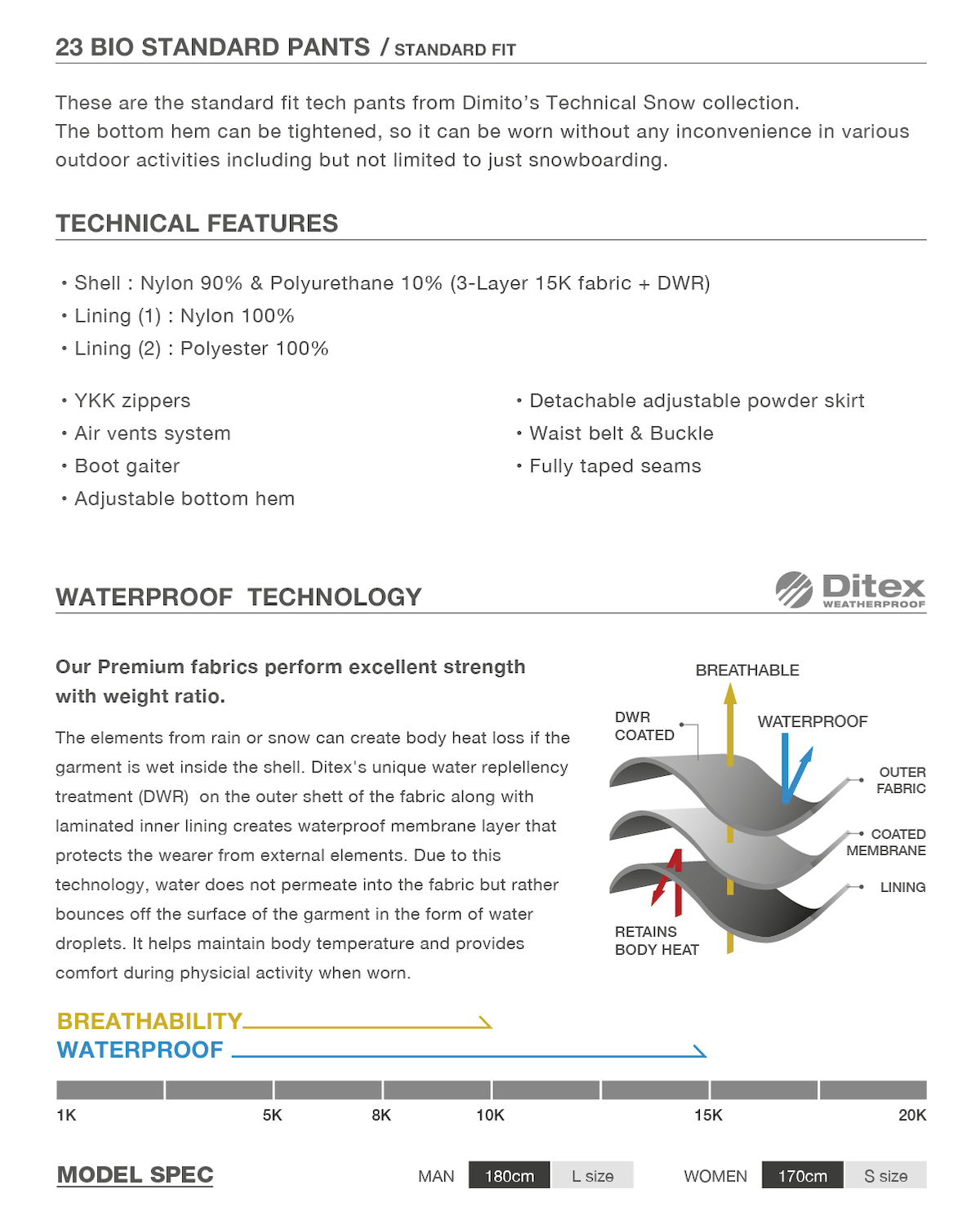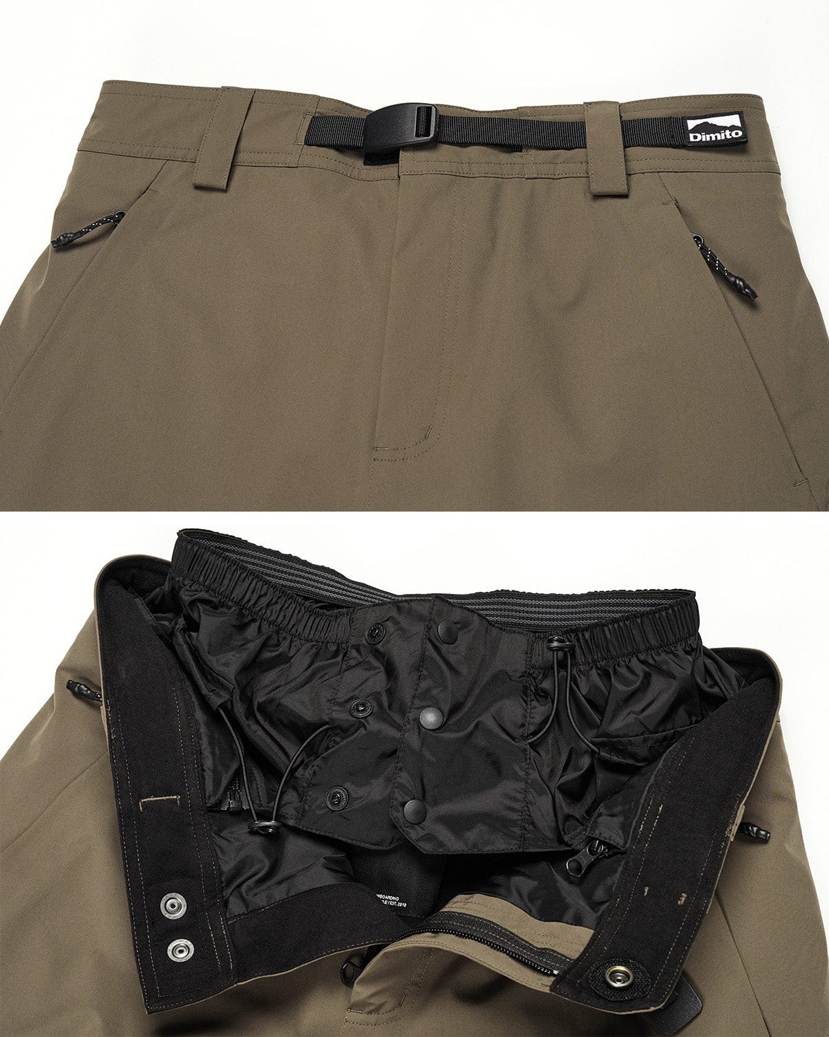 These are the standard fit tech pants fromDimito¡¯s Technical Snow collection. The bottom hemcan be tightened, so it can be worn withoutany inconvenience in various outdoor activitiesincluding but not limited to just snowboarding.