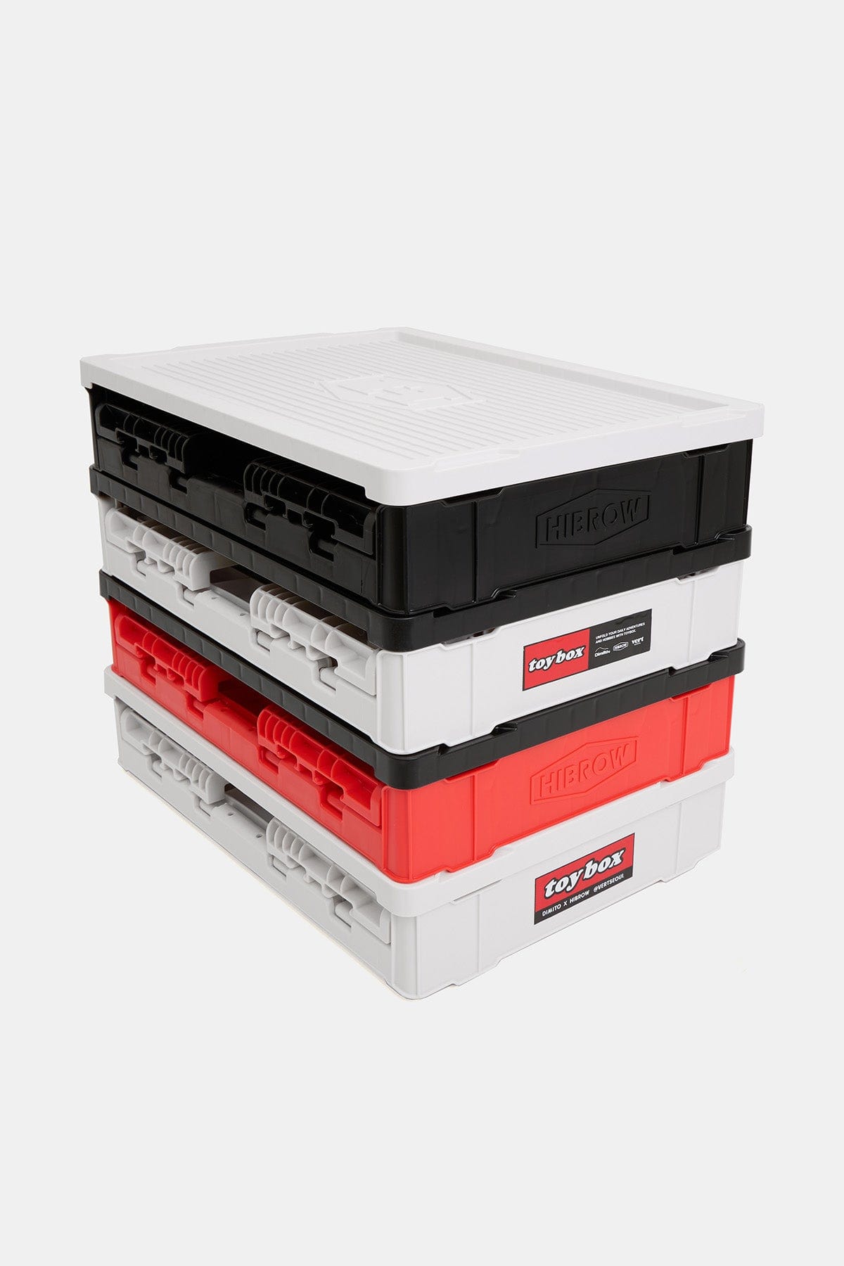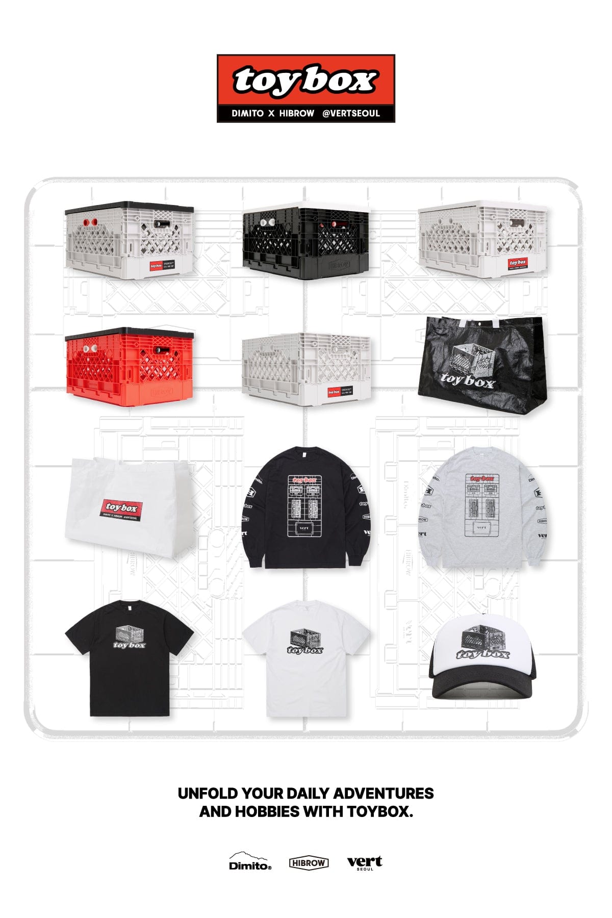 * (Flip Box), released with an exclusive design by DIMITO x HIBROW, is a product with capacity of 40 liters that can be used not only as an outdoor transport box, but also for storing various daily necessities with ease and also as a storage box for various hobby collection items.
