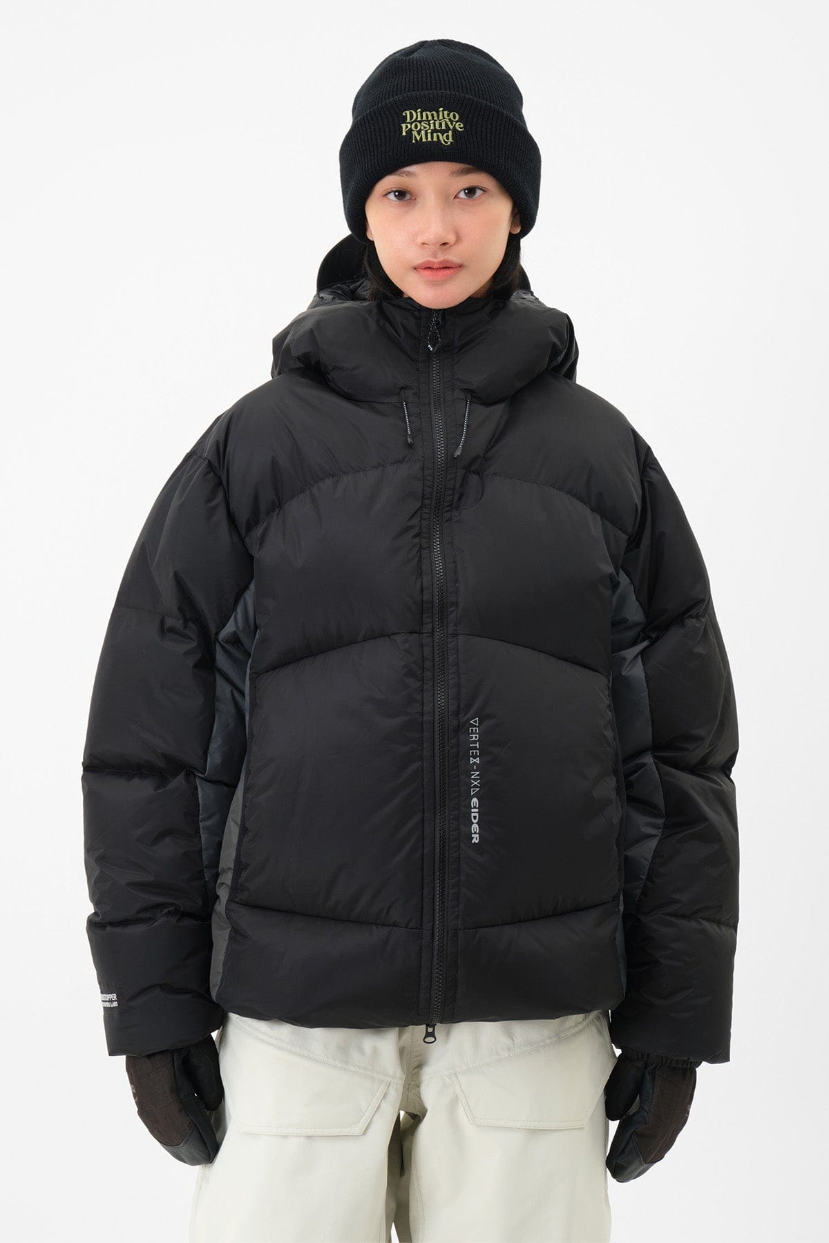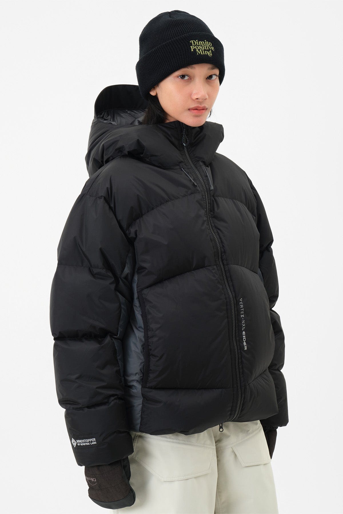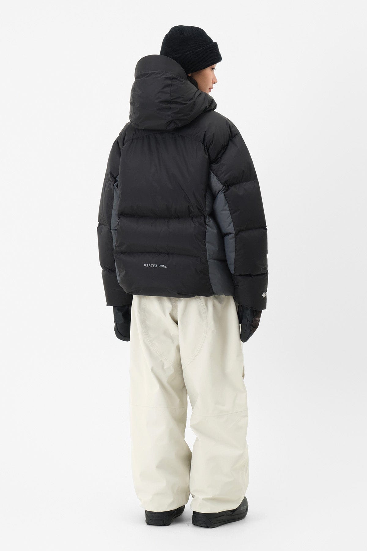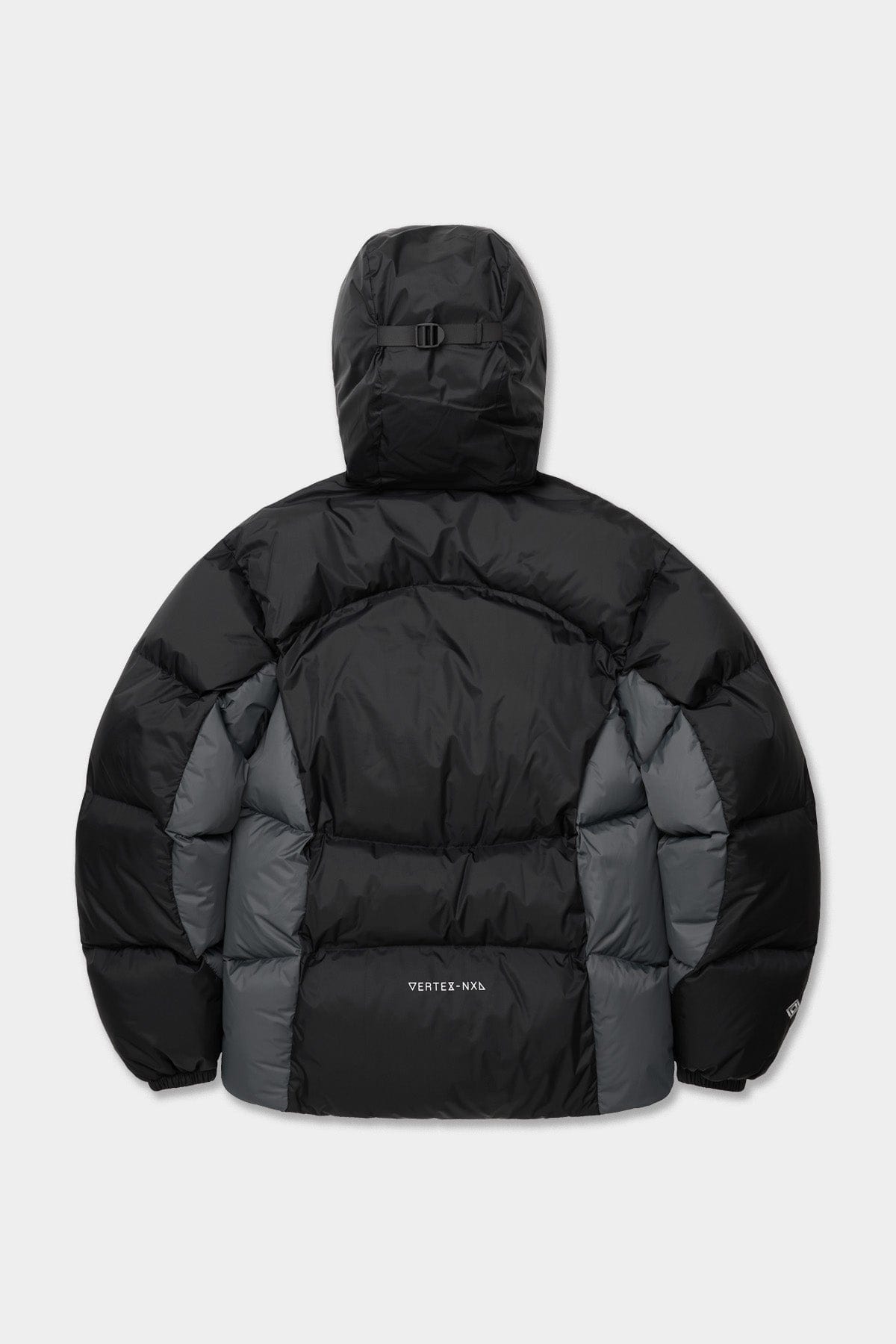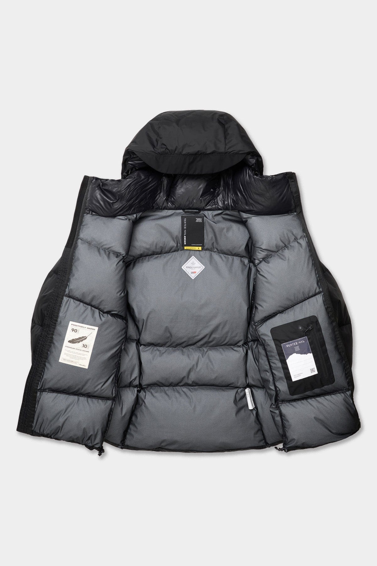 - Heavy down jacket optimized for cold elements with abundant fill volume on the hood and body