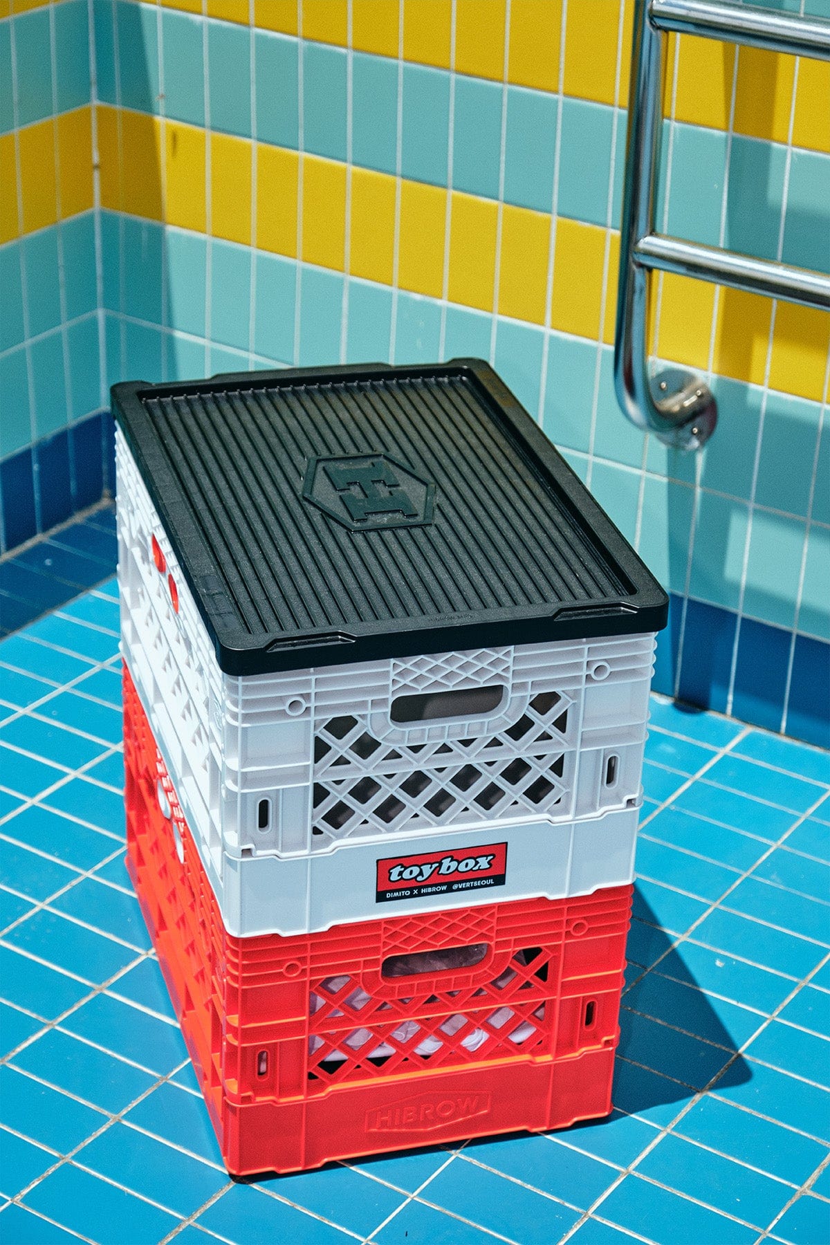 * (Flip Box), released with an exclusive design by DIMITO x HIBROW, is a product with capacity of 40 liters that can be used not only as an outdoor transport box, but also for storing various daily necessities with ease and also as a storage box for various hobby collection items.