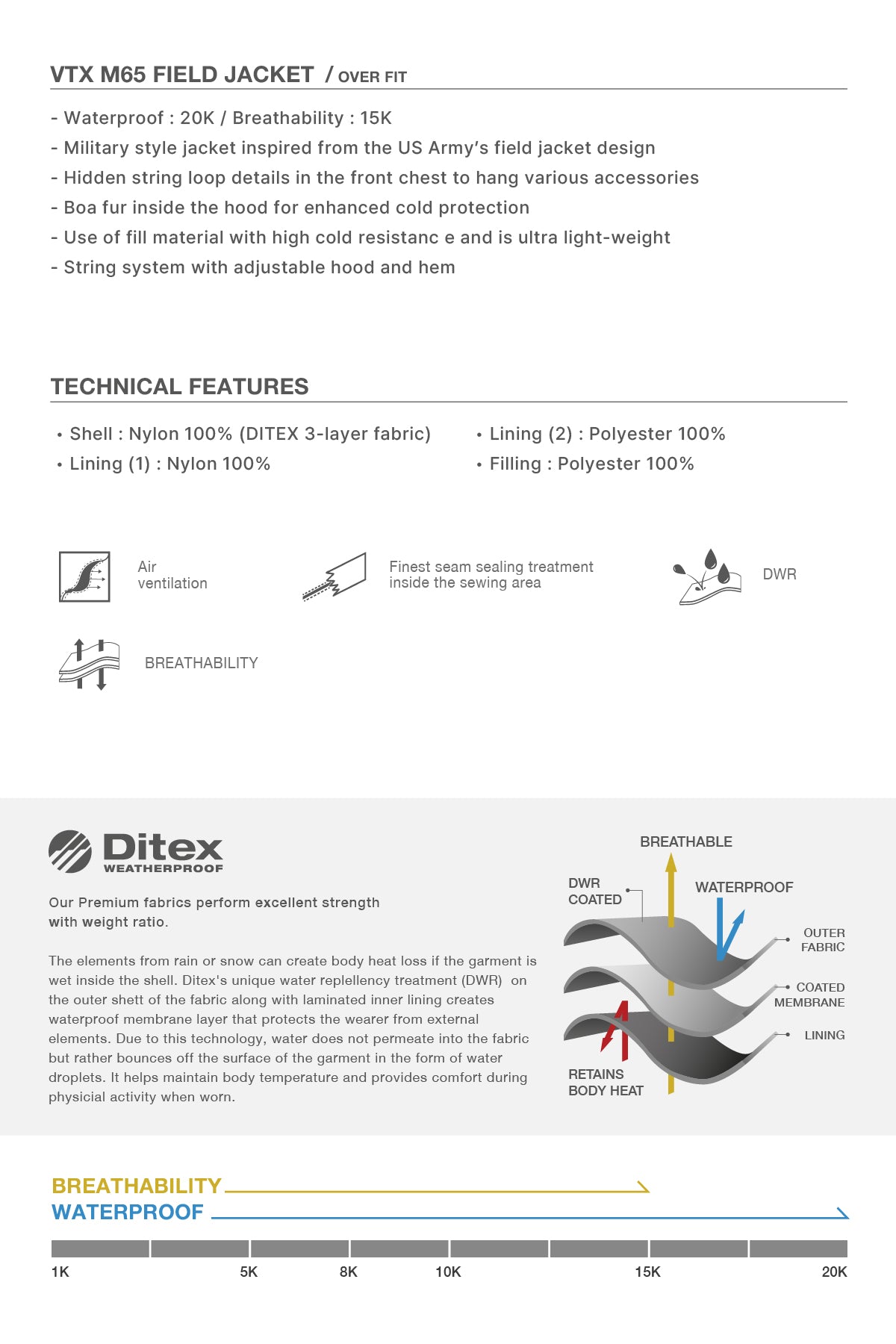 - Waterproof : 20K / Breathability : 15K