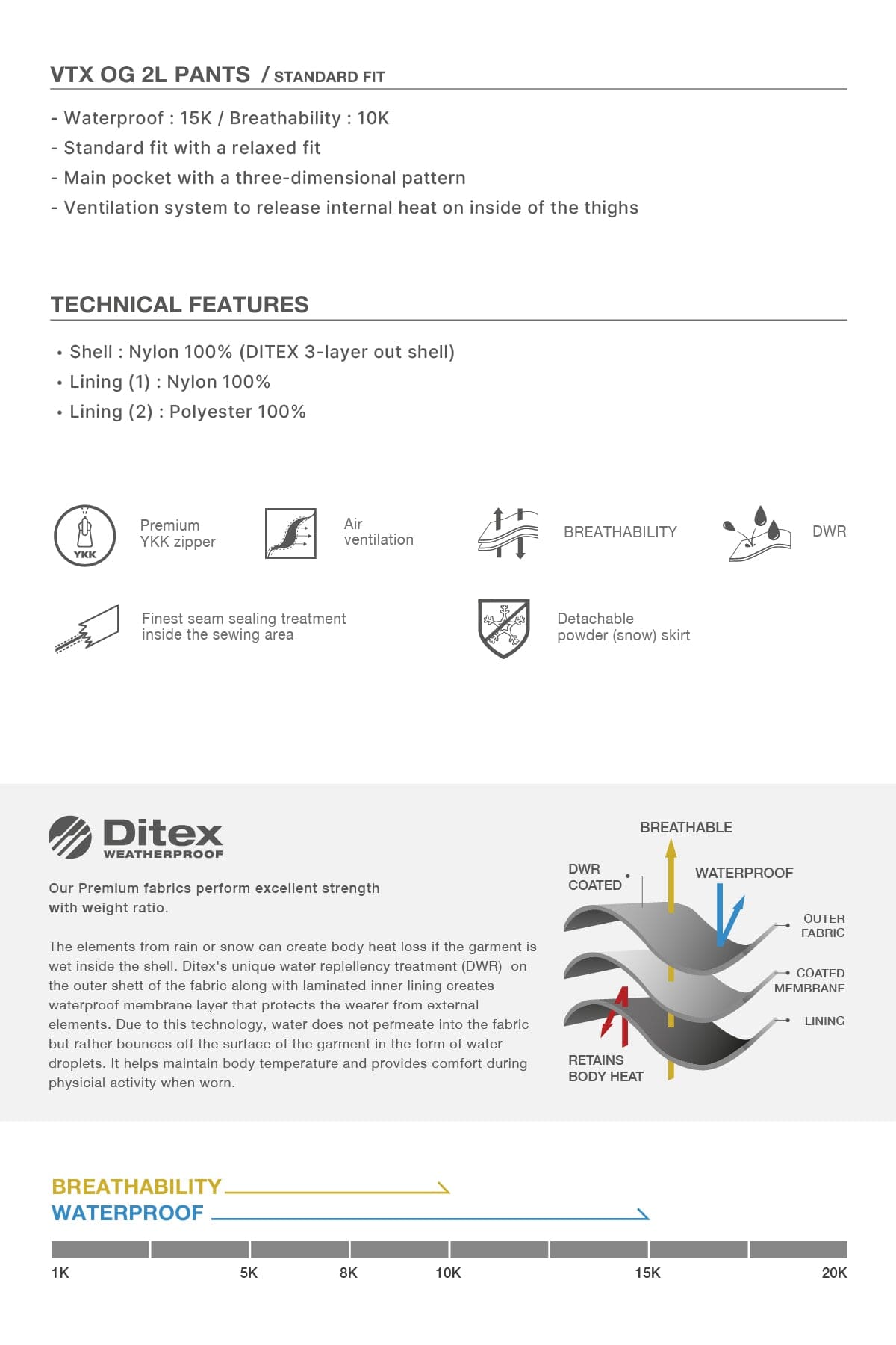 - Waterproof: 15K / Breathability : 10K