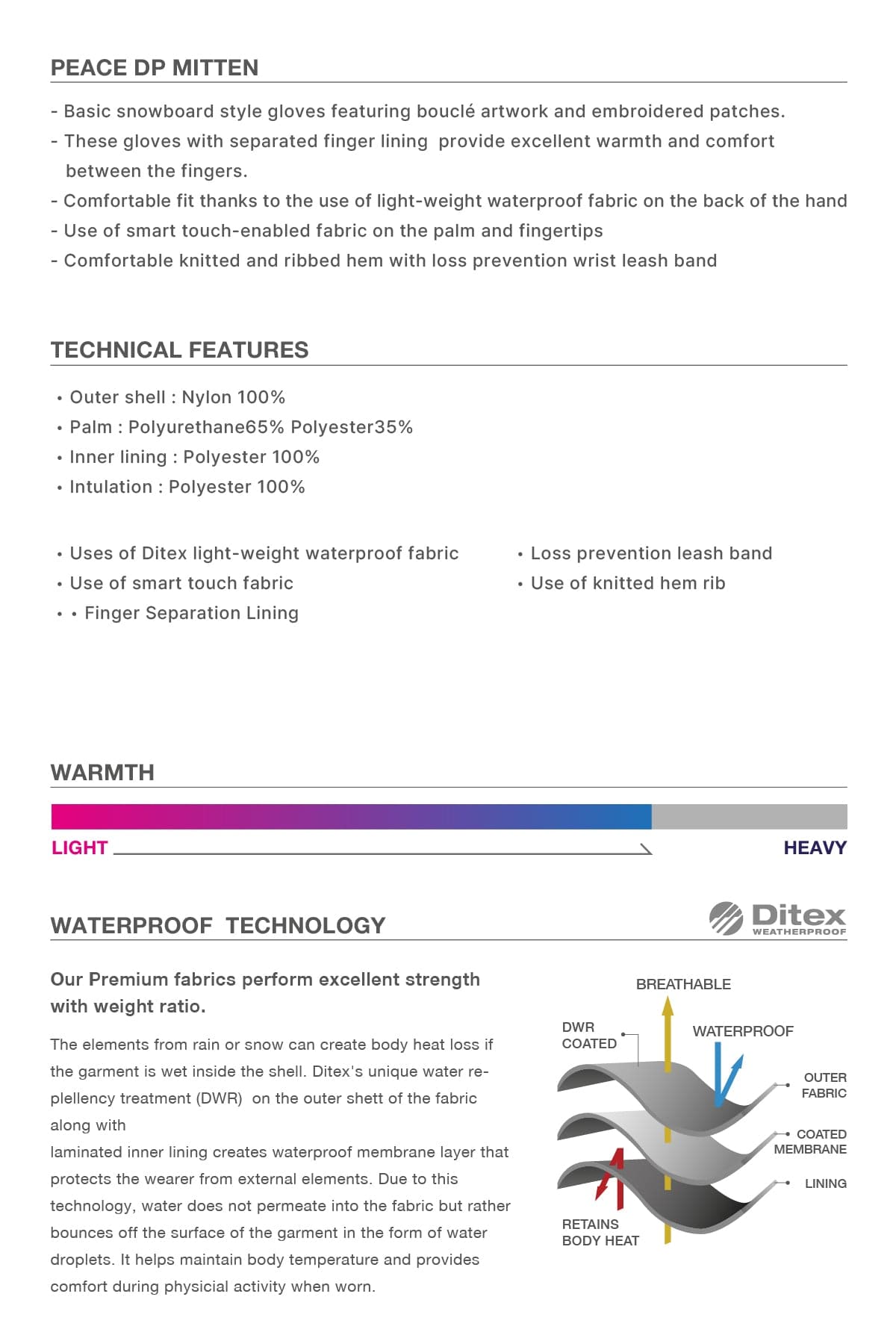 - Comfortable fit thanks to the use of light-weight waterproof fabric on the back of the hand