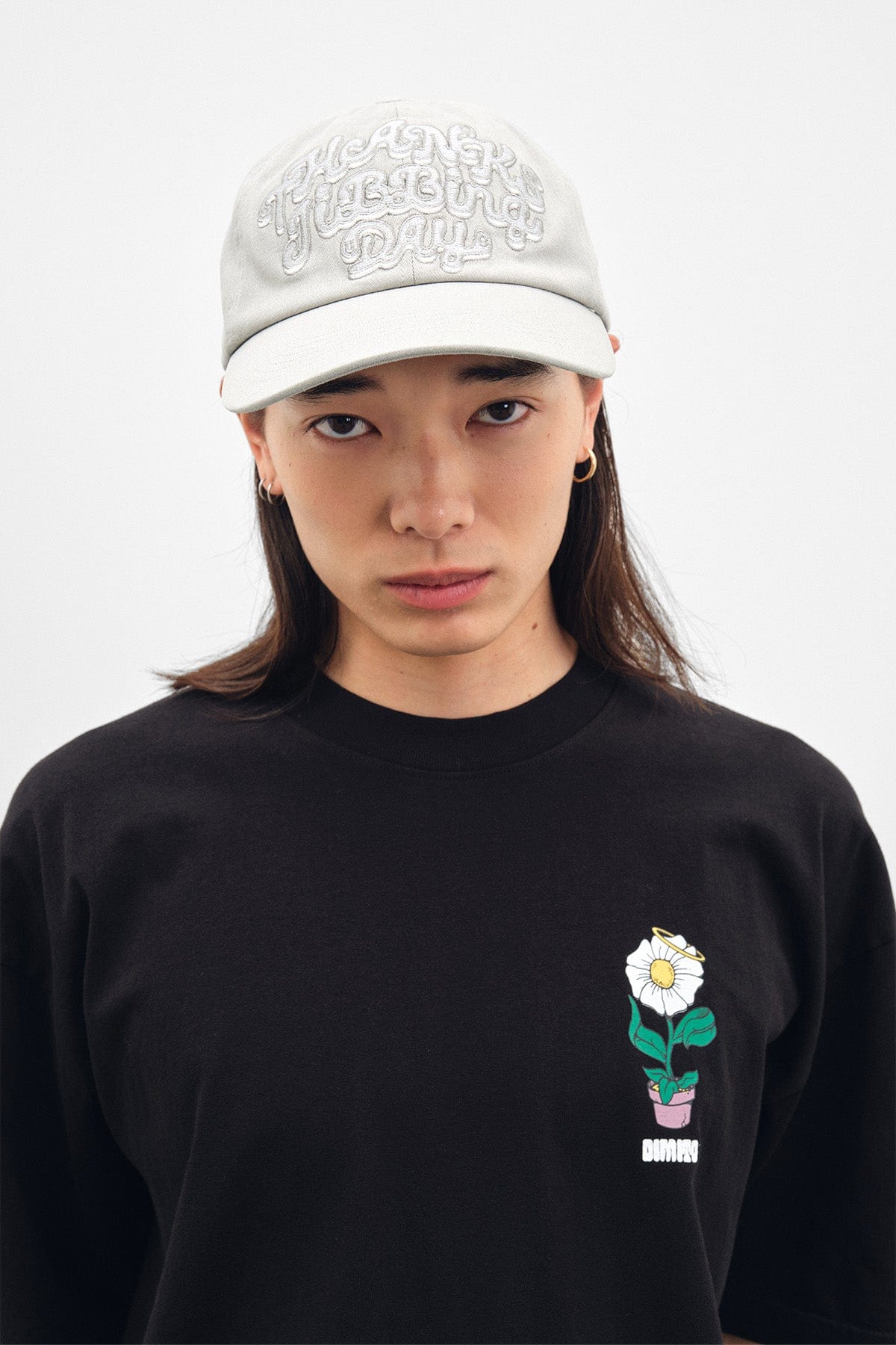 A 6-panel ball cap finished with a large Thanks Jibbing day signature embroidery artwork on the front and above the snap on the back. The vintage color scheme allows for matching with various styles while the back is accented with a snap and logo tab that can be adjusted for size fit.