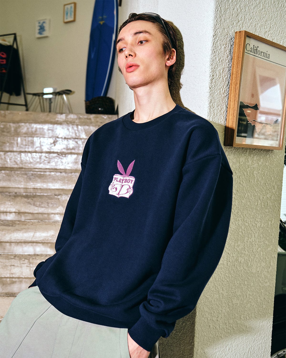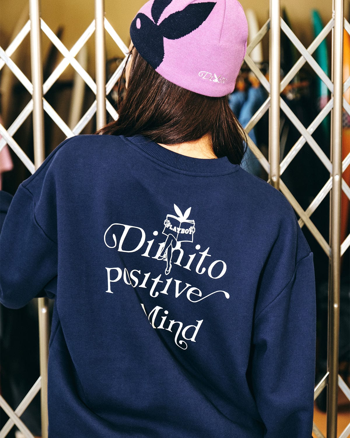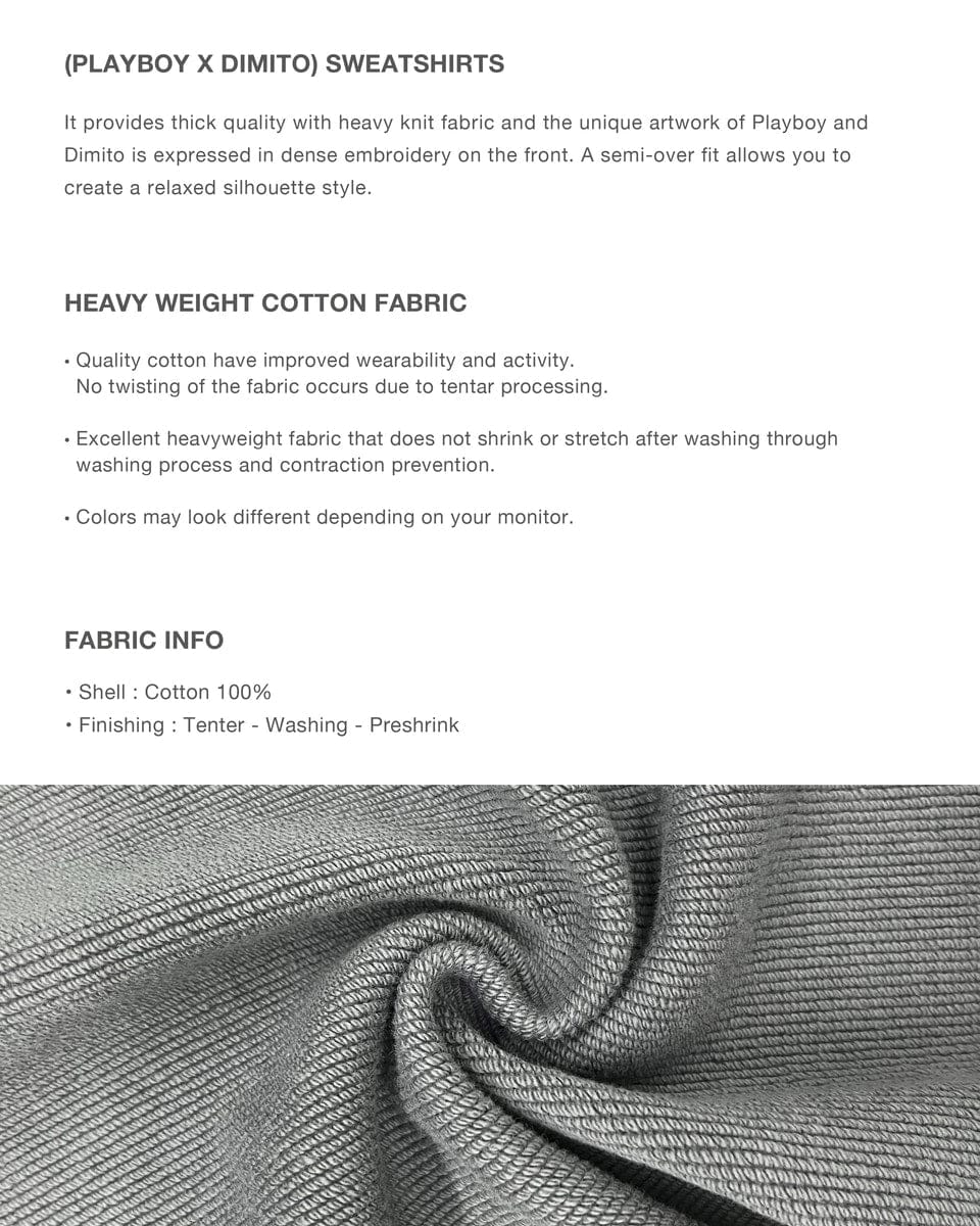 It provides thick quality with heavy knit fabric andthe unique artwork of Playboy and Dimito isexpressed in dense embroidery on the front.A semi-over fit allows you to create a relaxed silhouette style.