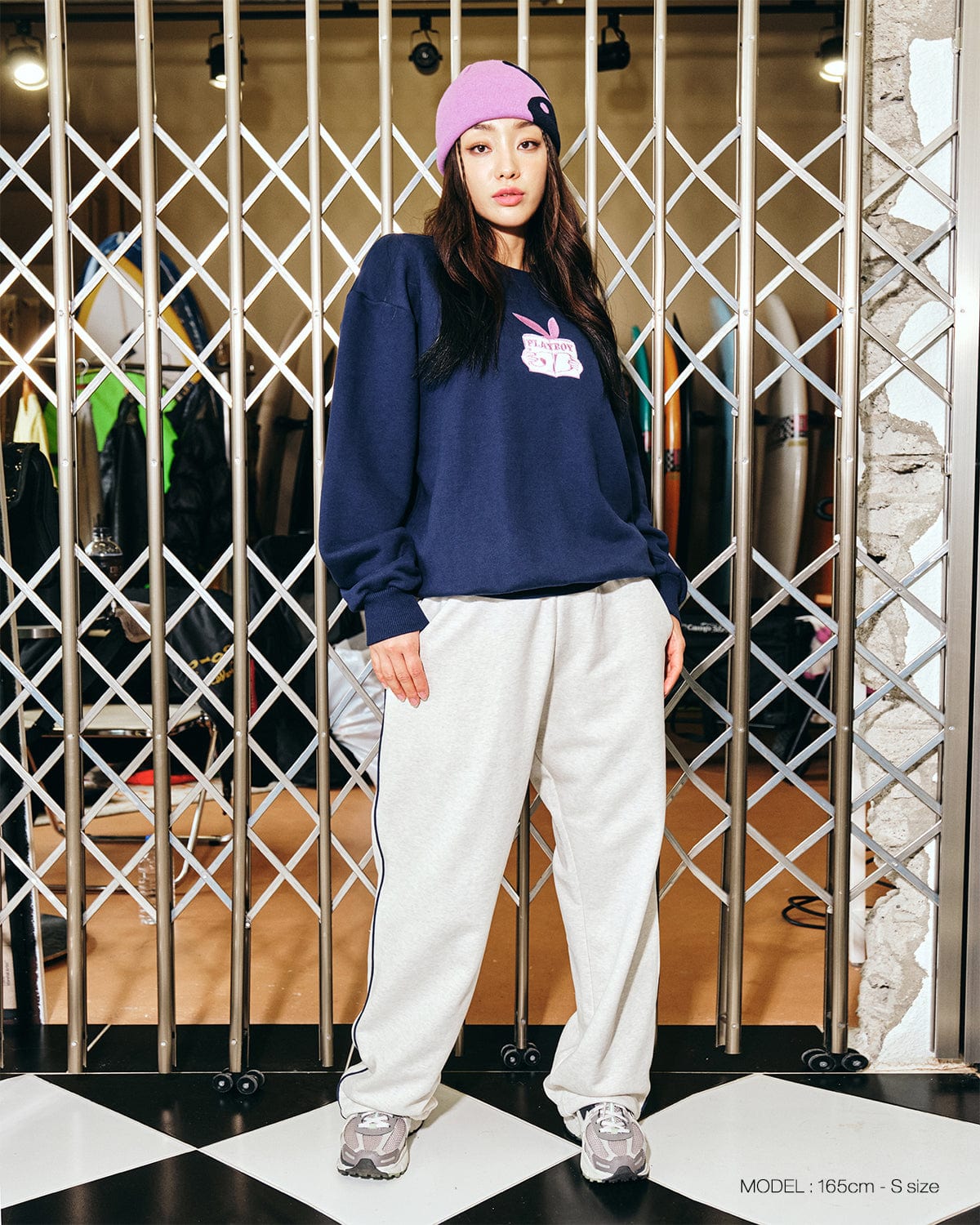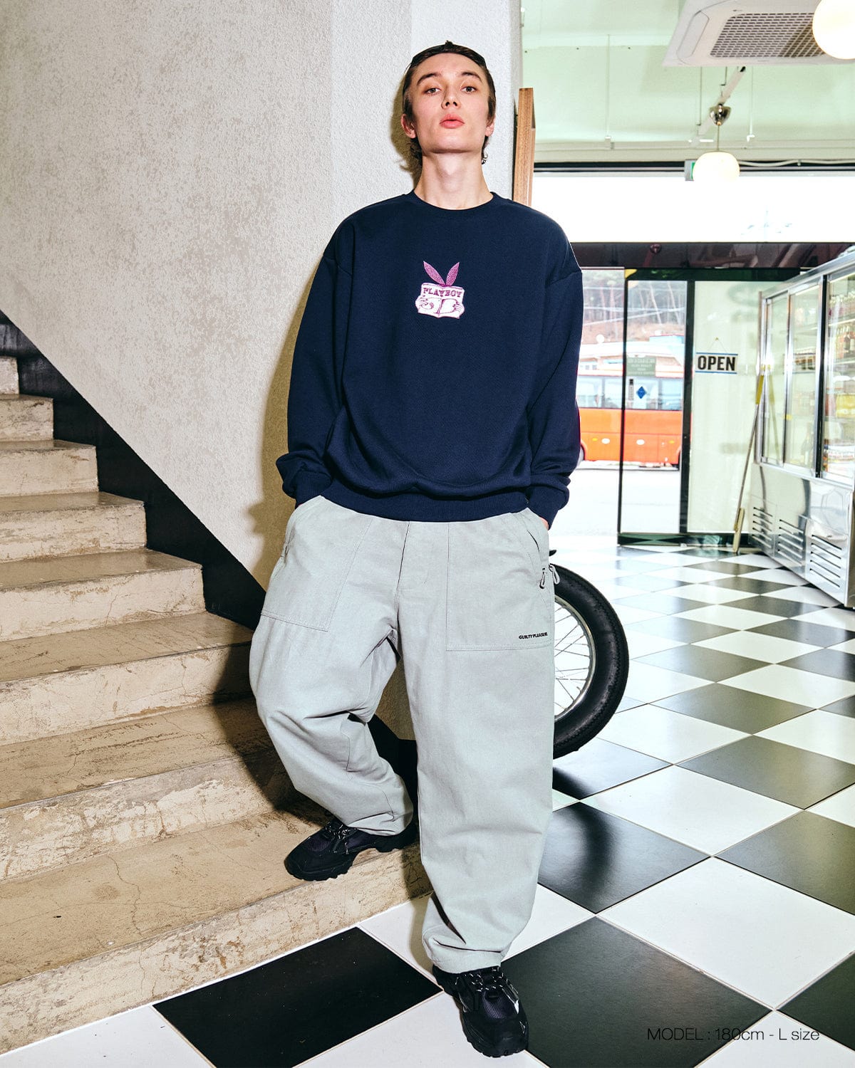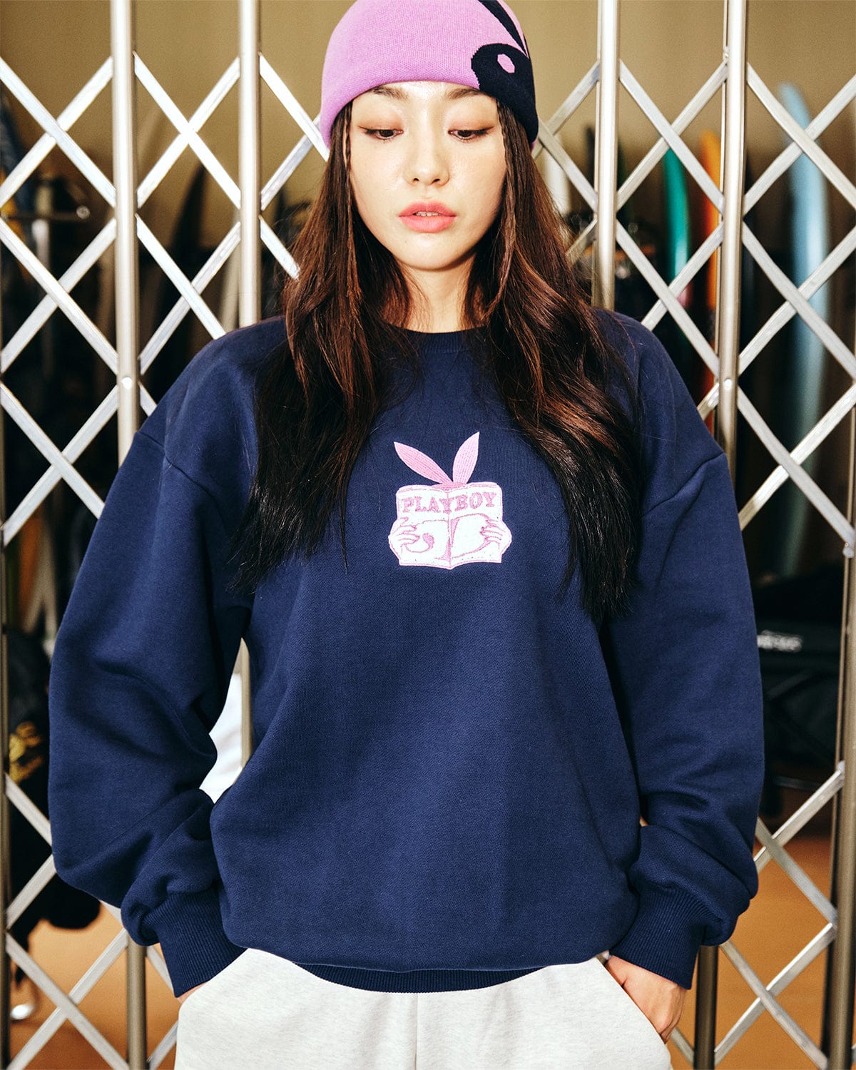 It provides thick quality with heavy knit fabric andthe unique artwork of Playboy and Dimito isexpressed in dense embroidery on the front.A semi-over fit allows you to create a relaxed silhouette style.