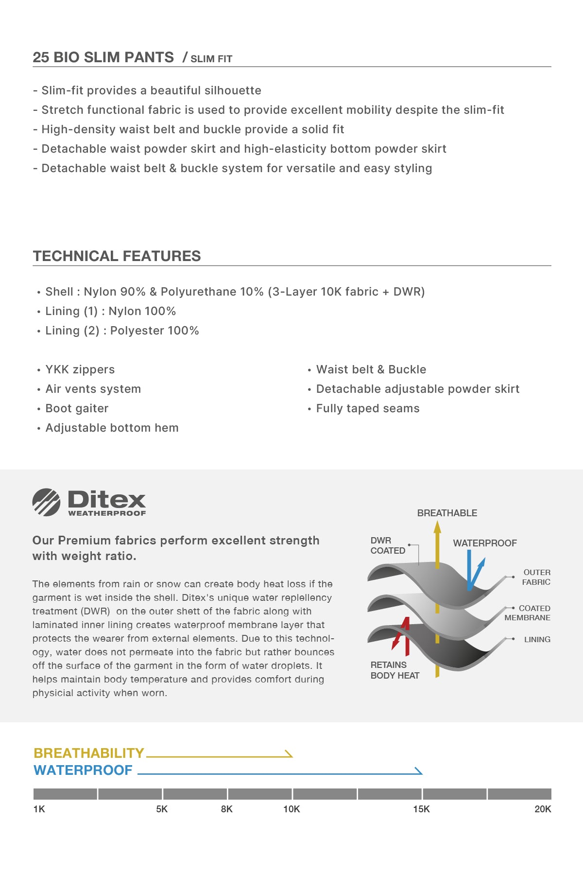 - Waterproof : 15K / Breathability : 10K
