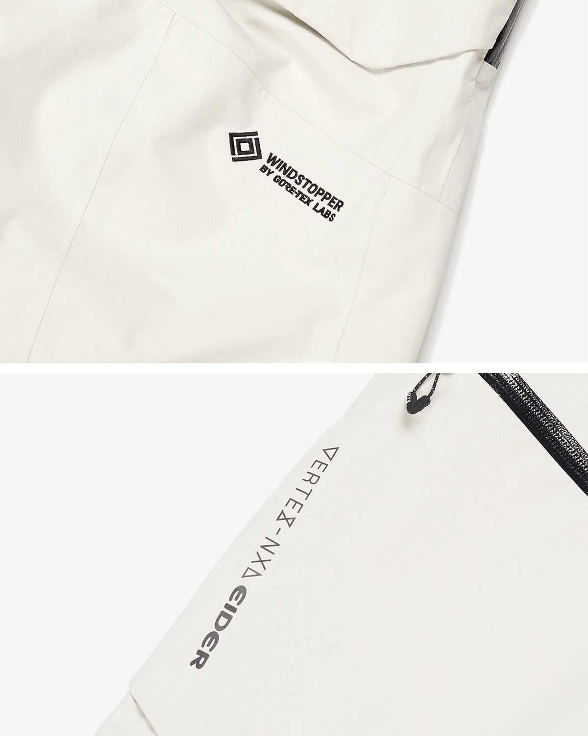 A ventilator is designed to quickly dissipateand release the heat generated inside the pants duringintense activity. The string at the hem can be worn ina jogger style, preventing the ankle cuff from draggingwhile walking. Gore-Tex Windstopper fabric is applied toprovide perfect windproof performance. These tech pantshave a natural fit and can be worn stylishly for snow- boardingand various outdoor activities.